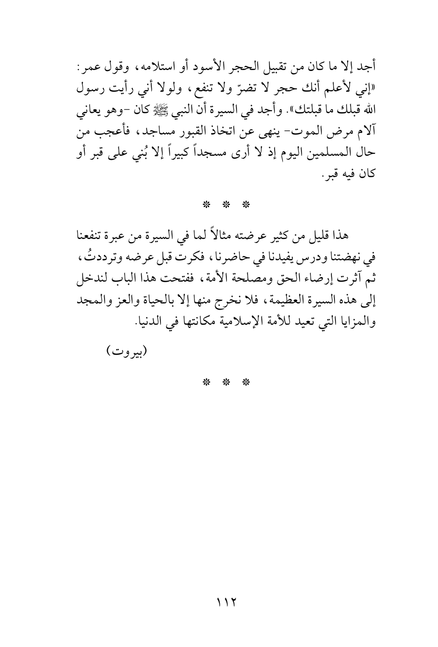 أجد إلا ما كان من تقبيل الحجر الأسود أو استلامه، وقول عمر: «إني لأعلم أنك حجر لا تضرّ ولا تنفع، ولولا أني رأيت رسول الله قبلك ما قبلتك». وأجد في السيرة أن النبي صلى الله عليه وسلم كان -وهو يعاني آلام مرض الموت- ينهى عن اتخاذ القبور مساجد، فأعجب من حال المسلمين اليوم إذ لا أرى مسجداً كبيراً إلا بُني على قبر أو كان فيه قبر.