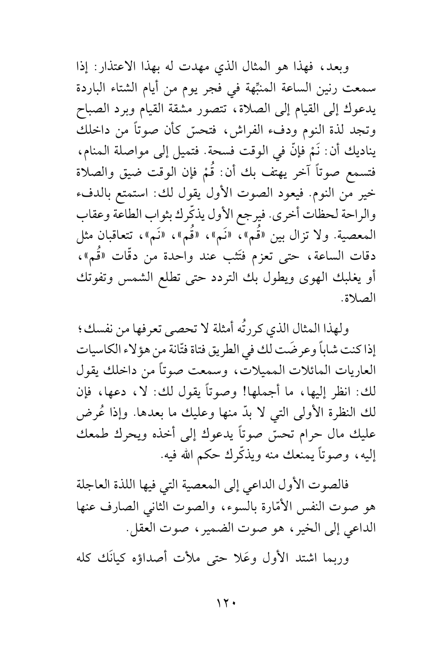 وبعد، فهذا هو المثال الذي مهدت له بهذا الاعتذار: إذا سمعت رنين الساعة المنبِّهة في فجر يوم من أيام الشتاء الباردة يدعوك إلى القيام إلى الصلاة، تتصور مشقة القيام وبرد الصباح وتجد لذة النوم ودفء الفراش، فتحسّ كأن صوتاً من داخلك يناديك أن: نَمْ فإنّ في الوقت فسحة. فتميل إلى مواصلة المنام، فتسمع صوتاً آخر يهتف بك أن: قُمْ فإن الوقت ضيق والصلاة خير من النوم. فيعود الصوت الأول يقول لك: استمتع بالدفء والراحة لحظات أخرى. فيرجع الأول يذكّرك بثواب الطاعة وعقاب المعصية. ولا تزال بين «قُم»، «نَم»، «قُم»، «نَم»، تتعاقبان مثل دقات الساعة، حتى تعزم فتَثب عند واحدة من دقّات «قُم»، أو يغلبك الهوى ويطول بك التردد حتى تطلع الشمس وتفوتك الصلاة.