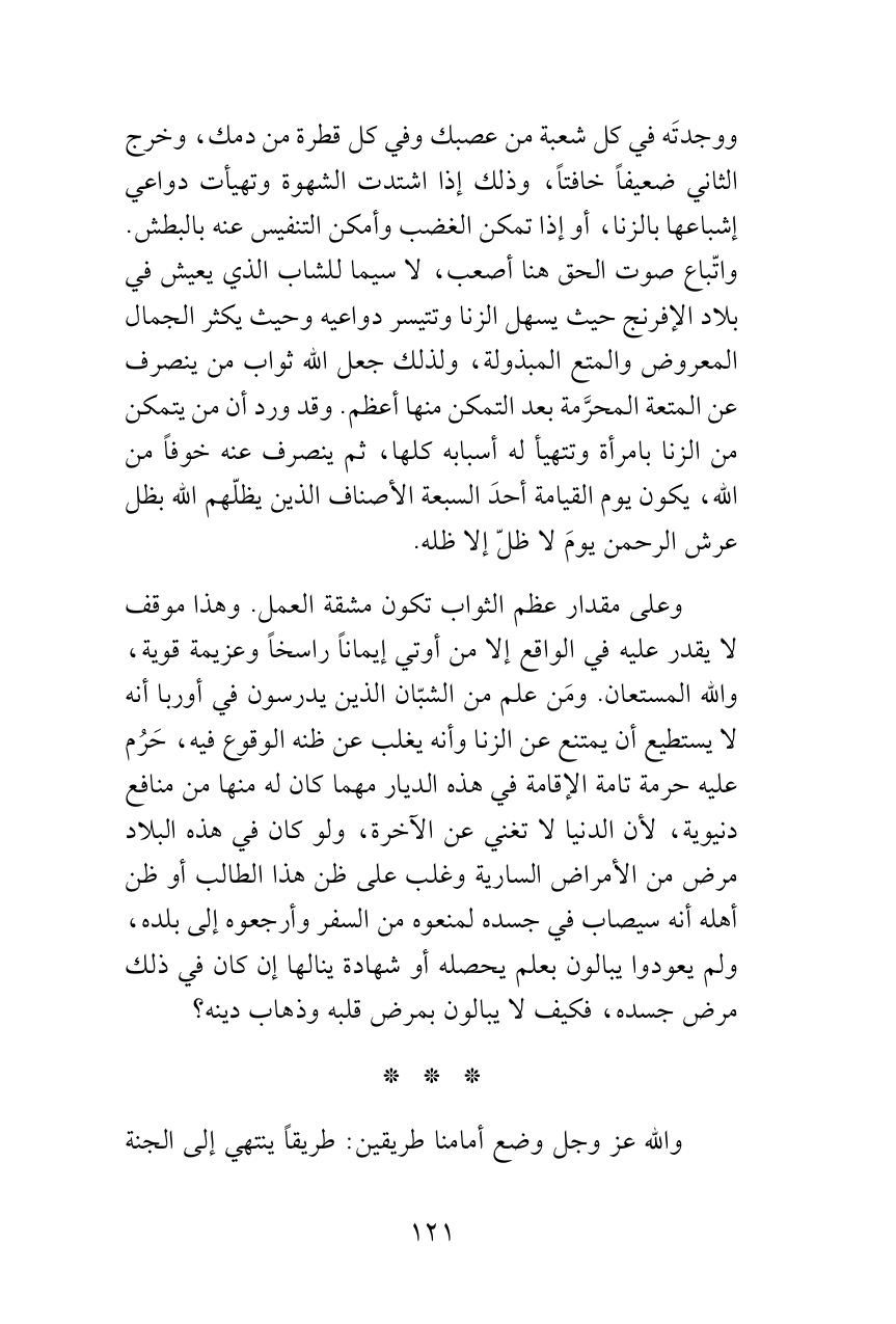 ووجدتَه في كل شعبة من عصبك وفي كل قطرة من دمك، وخرج الثاني ضعيفاً خافتاً، وذلك إذا اشتدت الشهوة وتهيأت دواعي إشباعها بالزنا، أو إذا تمكن الغضب وأمكن التنفيس عنه بالبطش. واتّباع صوت الحق هنا أصعب، لا سيما للشاب الذي يعيش في بلاد الإفرنج حيث يسهل الزنا وتتيسر دواعيه وحيث يكثر الجمال المعروض والمتع المبذولة، ولذلك جعل الله ثواب من ينصرف عن المتعة المحرَّمة بعد التمكن منها أعظم. وقد ورد أن من يتمكن من الزنا بامرأة وتتهيأ له أسبابه كلها، ثم ينصرف عنه خوفاً من الله، يكون يوم القيامة أحدَ السبعة الأصناف الذين يظلّهم الله بظل عرش الرحمن يومَ لا ظلّ إلا ظله.