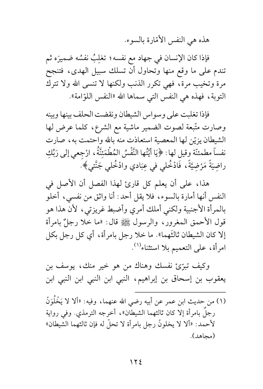 هذا، على أن يعلم كل قارئ لهذا الفصل أن الأصل في النفس أنها أمارة بالسوء، فلا يقل أحد: أنا واثق من نفسي، أخلو بالمرأة الأجنبية ولكني أملك أمري وأضبط غريزتي، لأن هذا هو قول الأحمق المغرور، والرسول صلى الله عليه وسلم قال: «ما خلا رجلٌ بامرأة إلا كان الشيطان ثالثَهما». ما خلا رجل بامرأة، أي كل رجل بكل امرأة، على التعميم بلا استثناء (¬1).