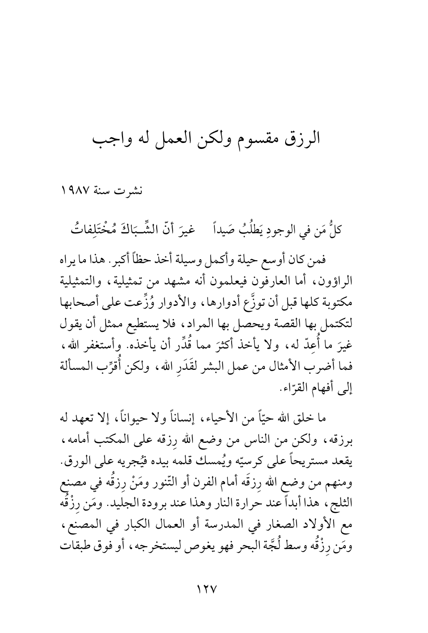 ما خلق الله حيّاً من الأحياء، إنساناً ولا حيواناً، إلا تعهد له برزقه، ولكن من الناس من وضع الله رِزقه على المكتب أمامه، يقعد مستريحاً على كرسيّه ويُمسك قلمه بيده فيُجريه على الورق. ومنهم من وضع الله رِزقَه أمام الفرن أو التّنور ومَنْ رِزقُه في مصنع الثلج، هذا أبداً عند حرارة النار وهذا عند برودة الجليد. ومَن رِزْقُه مع الأولاد الصغار في المدرسة أو العمال الكبار في المصنع، ومَن رِزْقُه وسط لُجَّة البحر فهو يغوص ليستخرجه، أو فوق طبقات