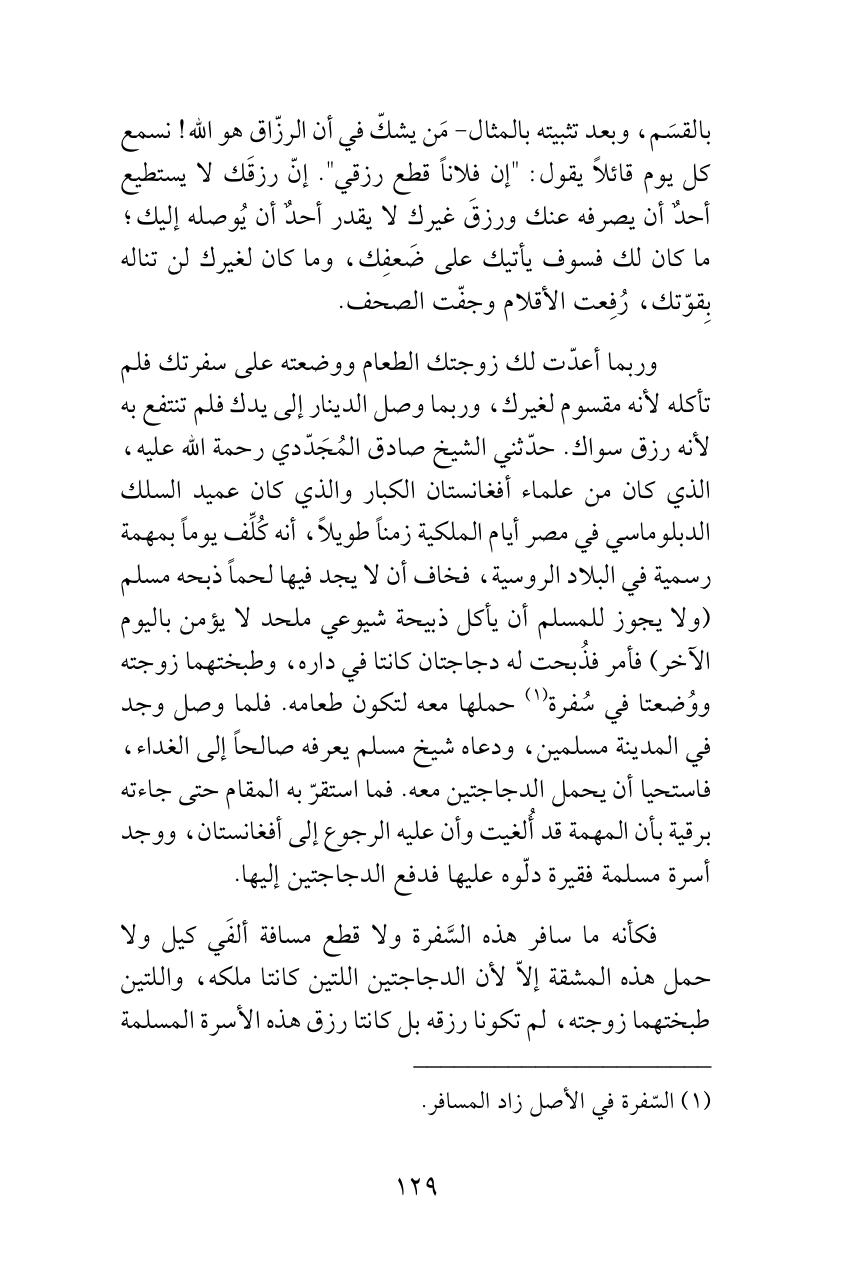وربما أعدّت لك زوجتك الطعام ووضعته على سفرتك فلم تأكله لأنه مقسوم لغيرك، وربما وصل الدينار إلى يدك فلم تنتفع به لأنه رزق سواك. حدّثني الشيخ صادق المُجَدّدي رحمة الله عليه، الذي كان من علماء أفغانستان الكبار والذي كان عميد السلك الدبلوماسي في مصر أيام الملكية زمناً طويلاً، أنه كُلِّف يوماً بمهمة رسمية في البلاد الروسية، فخاف أن لا يجد فيها لحماً ذبحه مسلم (ولا يجوز للمسلم أن يأكل ذبيحة شيوعي ملحد لا يؤمن باليوم الآخر) فأمر فذُبحت له دجاجتان كانتا في داره، وطبختهما زوجته ووُضعتا في سُفرة (¬1) حملها معه لتكون طعامه. فلما وصل وجد في المدينة مسلمين، ودعاه شيخ مسلم يعرفه صالحاً إلى الغداء، فاستحيا أن يحمل الدجاجتين معه. فما استقرّ به المقام حتى جاءته برقية بأن المهمة قد أُلغيت وأن عليه الرجوع إلى أفغانستان، ووجد أسرة مسلمة فقيرة دلّوه عليها فدفع الدجاجتين إليها.