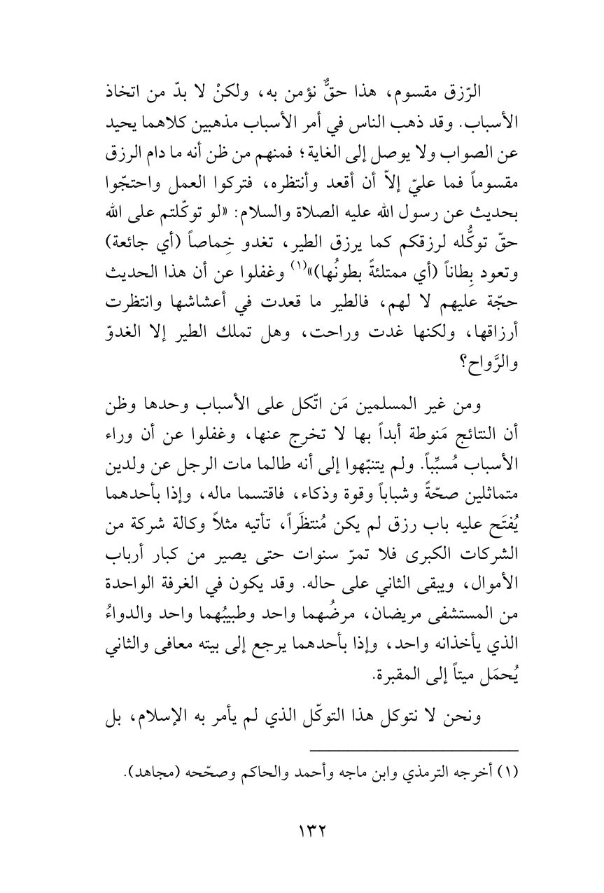 الرّزق مقسوم، هذا حقٌّ نؤمن به، ولكنْ لا بدّ من اتخاذ الأسباب. وقد ذهب الناس في أمر الأسباب مذهبين كلاهما يحيد عن الصواب ولا يوصل إلى الغاية؛ فمنهم من ظن أنه ما دام الرزق مقسوماً فما عليّ إلاّ أن أقعد وأنتظره، فتركوا العمل واحتجّوا بحديث عن رسول الله عليه الصلاة والسلام: «لو توكّلتم على الله حقّ توكُّله لرزقكم كما يرزق الطير، تغدو خِماصاً (أي جائعة) وتعود بِطاناً (أي ممتلئةً بطونُها)» (¬1) وغفلوا عن أن هذا الحديث حجّة عليهم لا لهم، فالطير ما قعدت في أعشاشها وانتظرت أرزاقها، ولكنها غدت وراحت، وهل تملك الطير إلا الغدوّ والرَّواح؟