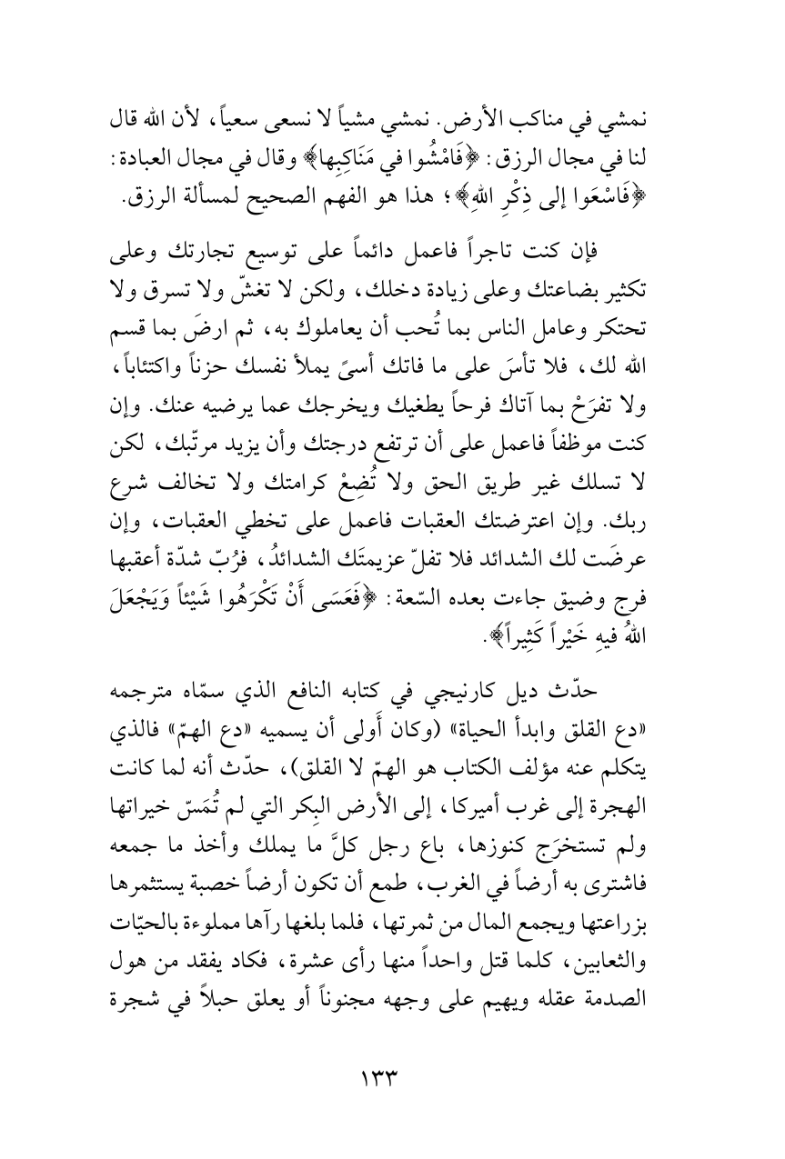 نمشي في مناكب الأرض. نمشي مشياً لا نسعى سعياً، لأن الله قال لنا في مجال الرزق: {فَامْشُوا في مَنَاكِبِها} وقال في مجال العبادة: {فَاسْعَوا إلى ذِكْرِ اللهِ}؛ هذا هو الفهم الصحيح لمسألة الرزق.