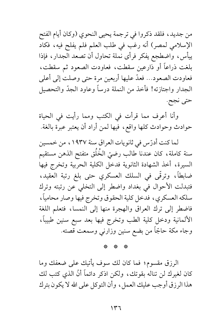 لما كنت أدرّس في ثانويات العراق سنة 1937، من خمسين سنة كاملة، كان عندنا طالب رضيّ الخُلُق متفتح الذهن مستقيم السيرة، أخذ الشهادة الثانوية فدخل الكلية الحربية وتخرج فيها ضابطاً، وترقّى في السلك العسكري حتى بلغ رتبة العقيد، فتبدلت الأحوال في بغداد واضطر إلى التخلي عن رتبته وترك سلكه العسكري، فدخل كلية الحقوق وتخرج فيها وصار محامياً، فاضطر إلى ترك العراق والهجرة منها إلى النمسا، فتعلم اللغة الألمانية ودخل كلية الطب وتخرج فيها بعد سبع سنين طبيباً، وجاء مكة حاجّاً من بضع سنين وزارني وسمعت قصته.