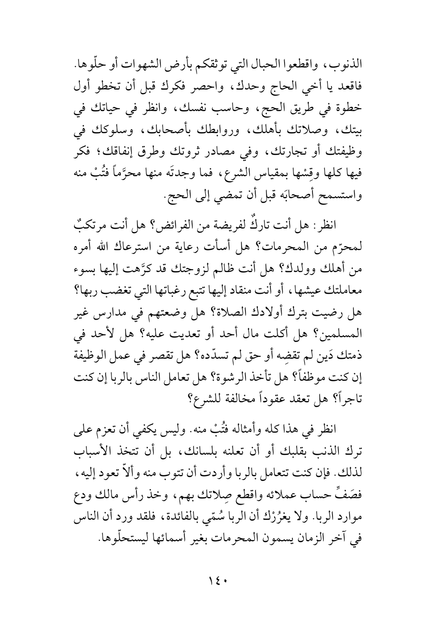 الذنوب، واقطعوا الحبال التي توثقكم بأرض الشهوات أو حلّوها. فاقعد يا أخي الحاج وحدك، واحصر فكرك قبل أن تخطو أول خطوة في طريق الحج، وحاسب نفسك، وانظر في حياتك في بيتك، وصلاتك بأهلك، وروابطك بأصحابك، وسلوكك في وظيفتك أو تجارتك، وفي مصادر ثروتك وطرق إنفاقك؛ فكر فيها كلها وقِسْها بمقياس الشرع، فما وجدتَه منها محرَّماً فتُبْ منه واستسمح أصحابَه قبل أن تمضي إلى الحج.