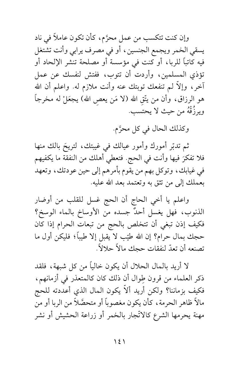 لا أريد بالمال الحلال أن يكون خالياً من كل شبهة، فلقد ذكر العلماء من قرون طِوال أن ذلك كان كالمتعذر في أزمانهم، فكيف بزماننا؟ ولكن أريد ألاّ يكون المال الذي أعددته للحج مالاً ظاهر الحرمة، كأن يكون مغصوباً أو متحصَّلاً من الربا أو من مهنة يحرمها الشرع كالاتّجار بالخمر أو زراعة الحشيش أو نشر