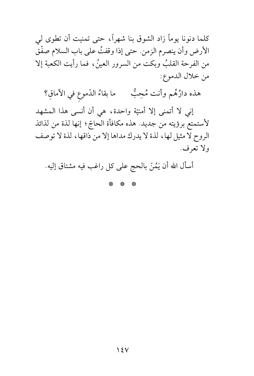 إني لا أتمنى إلا أمنيّة واحدة، هي أن أنسى هذا المشهد لأستمتع برؤيته من جديد. هذه مكافأة الحاجّ؛ إنها لذة من لذائذ الروح لا مثيل لها، لذة لا يدرك مداها إلا من ذاقها، لذة لا توصف ولا تعرف.