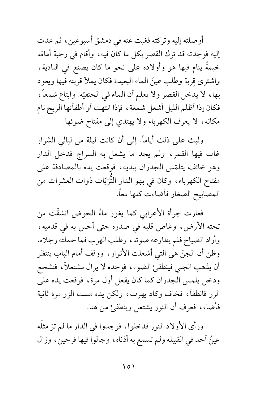 فغارت جرأة الأعرابي كما يغور ماءُ الحوض انشقّت من تحته الأرض، وغاص قلبه في صدره حتى أحس به في قدميه، وأراد الصياح فلم يطاوعه صوته، وطلب الهرب فما حملته رجلاه. وظن أن الجنّ هي التي أشعلت الأنوار، ووقف أمام الباب ينتظر أن يذهب الجني فينطفئ الضوء، فوجده لا يزال مشتعلاً، فتشجع ودخل يلمس الجدران كما كان يفعل أول مرة، فوقعت يده على الزر فانطفأ، فخاف وكاد يهرب، ولكن يده مست الزر مرة ثانية فأضاء، فعرف أن النور يشتعل وينطفئ من هنا.