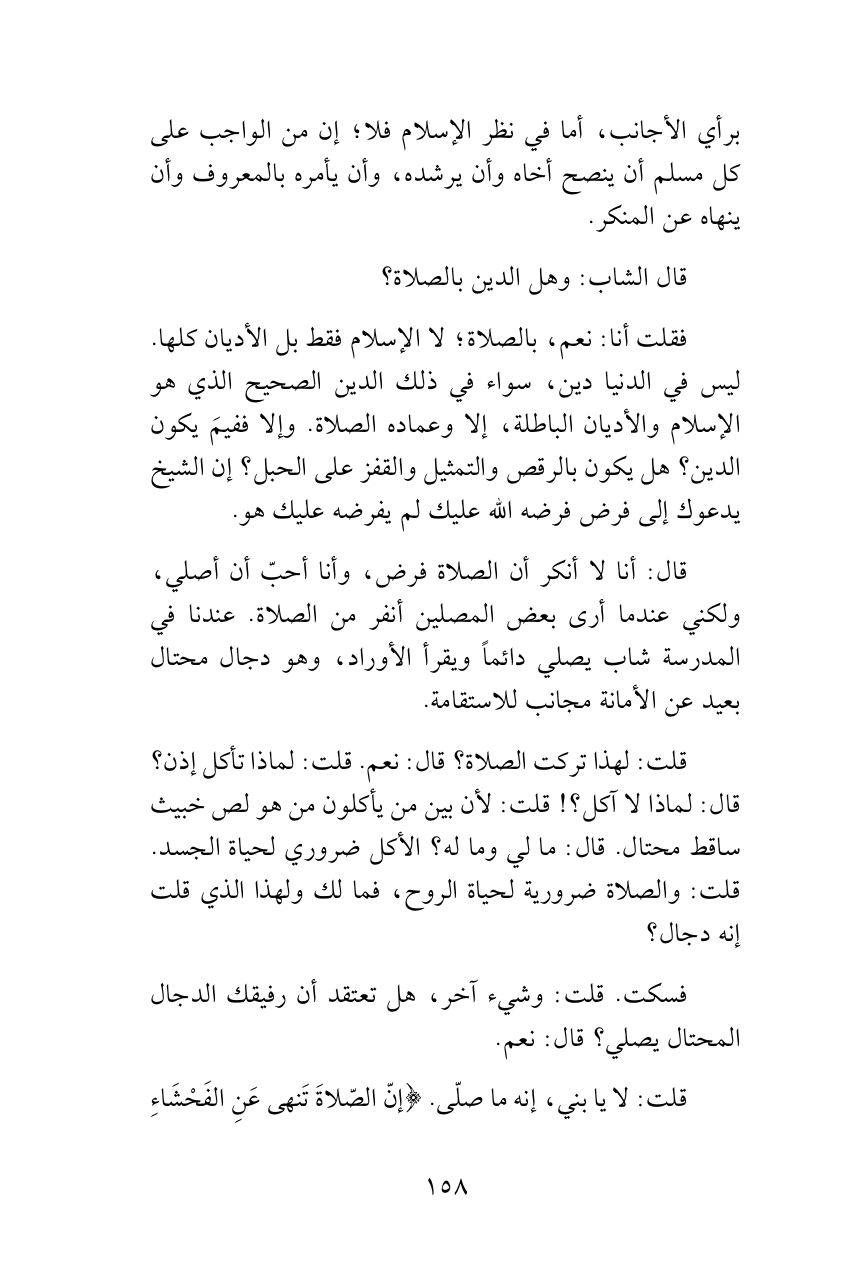 قلت: لهذا تركت الصلاة؟ قال: نعم. قلت: لماذا تأكل إذن؟ قال: لماذا لا آكل؟! قلت: لأن بين من يأكلون من هو لص خبيث ساقط محتال. قال: ما لي وما له؟ الأكل ضروري لحياة الجسد. قلت: والصلاة ضرورية لحياة الروح، فما لك ولهذا الذي قلت إنه دجال؟