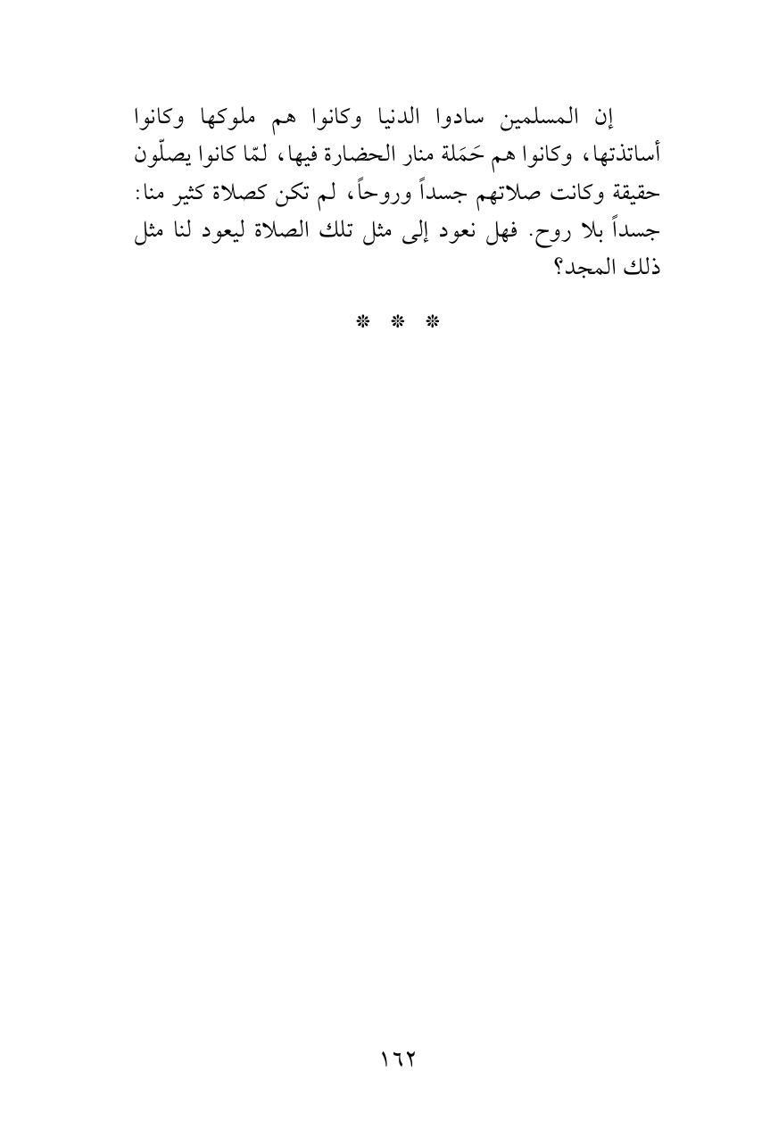 إن المسلمين سادوا الدنيا وكانوا هم ملوكها وكانوا أساتذتها، وكانوا هم حَمَلة منار الحضارة فيها، لمّا كانوا يصلّون حقيقة وكانت صلاتهم جسداً وروحاً، لم تكن كصلاة كثير منا: جسداً بلا روح. فهل نعود إلى مثل تلك الصلاة ليعود لنا مثل ذلك المجد؟