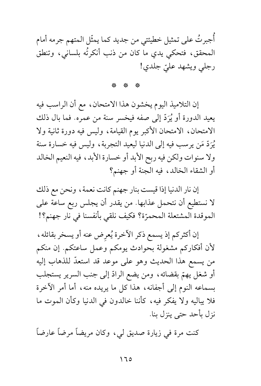 إن التلاميذ اليوم يخشون هذا الامتحان، مع أن الراسب فيه يعيد الدورة أو يُرَدّ إلى صفه فيخسر سنة من عمره. فما بال ذلك الامتحان، الامتحان الأكبر يوم القيامة، وليس فيه دورة ثانية ولا يُرَدّ مَن يرسب فيه إلى الدنيا ليعيد التجربة، وليس فيه خسارة سنة ولا سنوات ولكن فيه ربح الأبد أو خسارة الأبد، فيه النعيم الخالد أو الشقاء الخالد، فيه الجنة أو جهنم؟