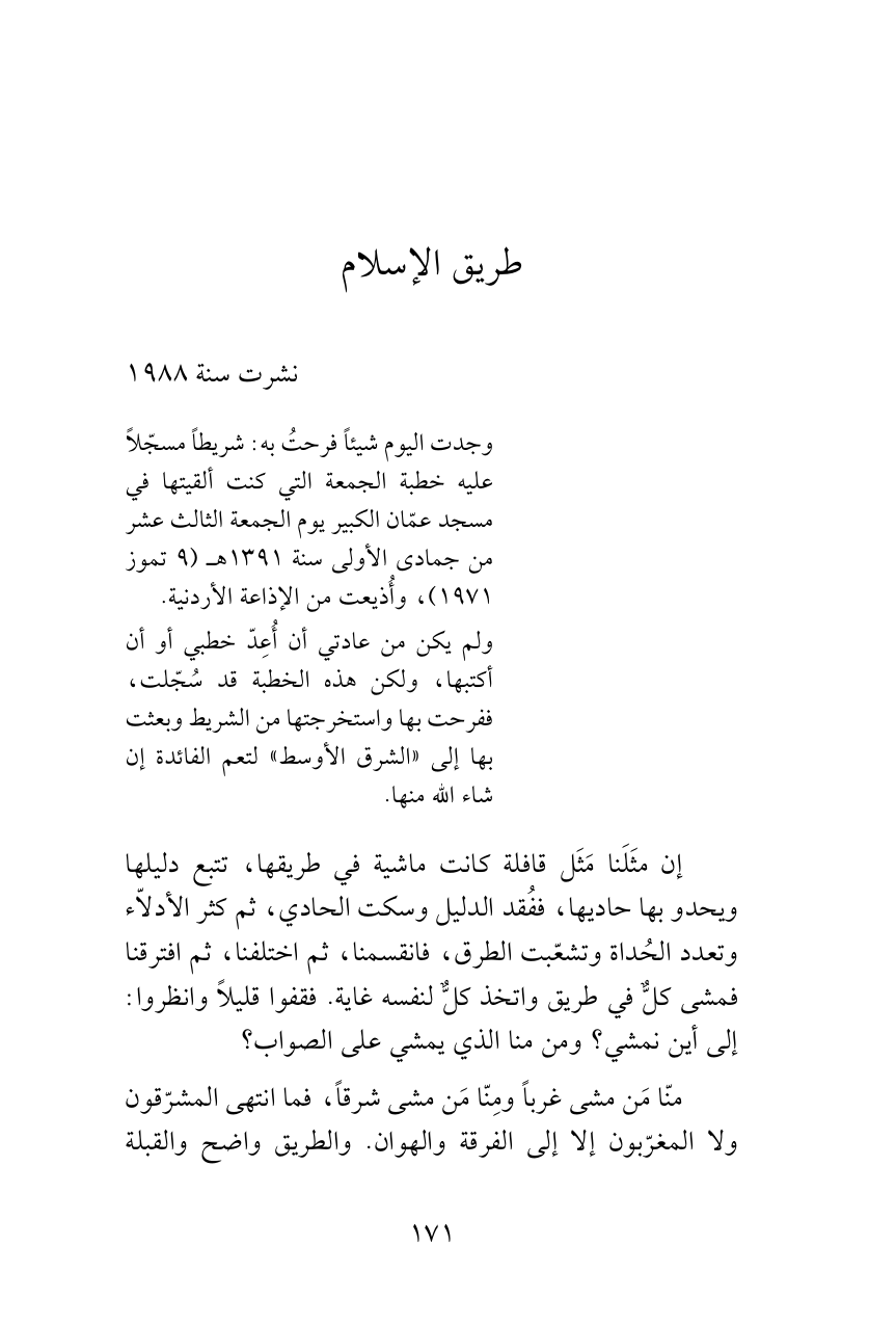 [وجدت اليوم شيئاً فرحتُ به: شريطاً مسجّلاً عليه خطبة الجمعة التي كنت ألقيتها في مسجد عمّان الكبير يوم الجمعة الثالث عشر من جمادى الأولى سنة 1391هـ (9 تموز 1971)، وأُذيعت من الإذاعة الأردنية.