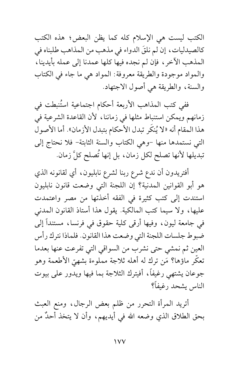 أفتريدون أن ندع شرع ربنا لشرع نابليون، أي لقانونه الذي هو أبو القوانين المدنية؟ إن اللجنة التي وضعت قانون نابليون استندت إلى كتب كثيرة في الفقه أخذتها من مصر واعتمدت عليها، ولا سيما كتب المالكية. يقول هذا أستاذ القانون المدني في جامعة ليون، وفيها أرقى كلية حقوق في فرنسا، مستنداً إلى ضبوط جلسات اللجنة التي وضعت هذا القانون. فلماذا نترك رأس العين ثم نمشي حتى نشرب من السواقي التي تفرعت عنها بعدما تعكّر ماؤها؟ مَن ترك له أهله ثلاجة مملوءة بشهيّ الأطعمة وهو جوعان يشتهي رغيفاً، أفيترك الثلاجة بما فيها ويدور على بيوت الناس يشحد رغيفاً؟