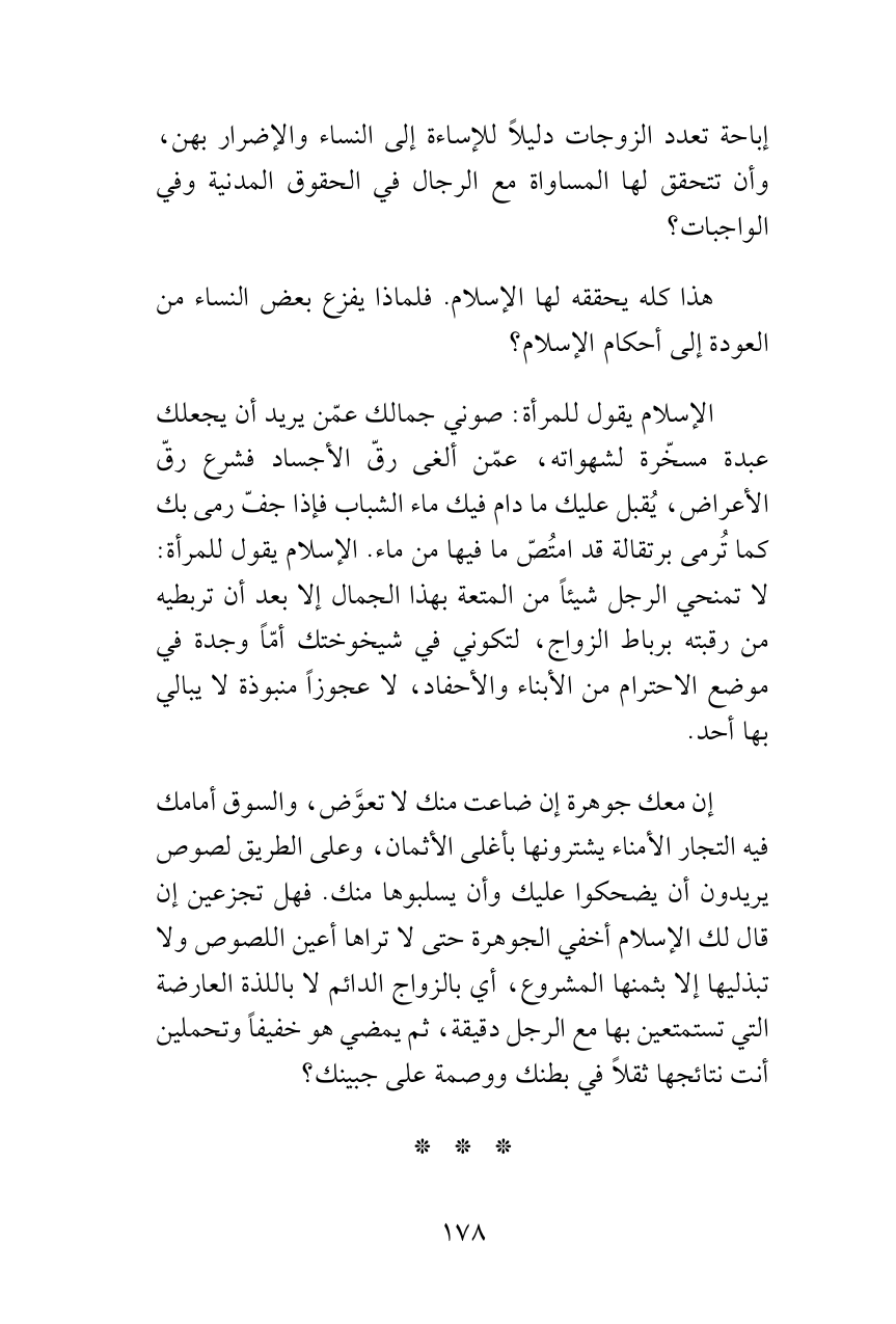 الإسلام يقول للمرأة: صوني جمالك عمّن يريد أن يجعلك عبدة مسخّرة لشهواته، عمّن ألغى رقّ الأجساد فشرع رقّ الأعراض، يُقبل عليك ما دام فيك ماء الشباب فإذا جفّ رمى بك كما تُرمى برتقالة قد امتُصّ ما فيها من ماء. الإسلام يقول للمرأة: لا تمنحي الرجل شيئاً من المتعة بهذا الجمال إلا بعد أن تربطيه من رقبته برباط الزواج، لتكوني في شيخوختك أمّاً وجدة في موضع الاحترام من الأبناء والأحفاد، لا عجوزاً منبوذة لا يبالي بها أحد.