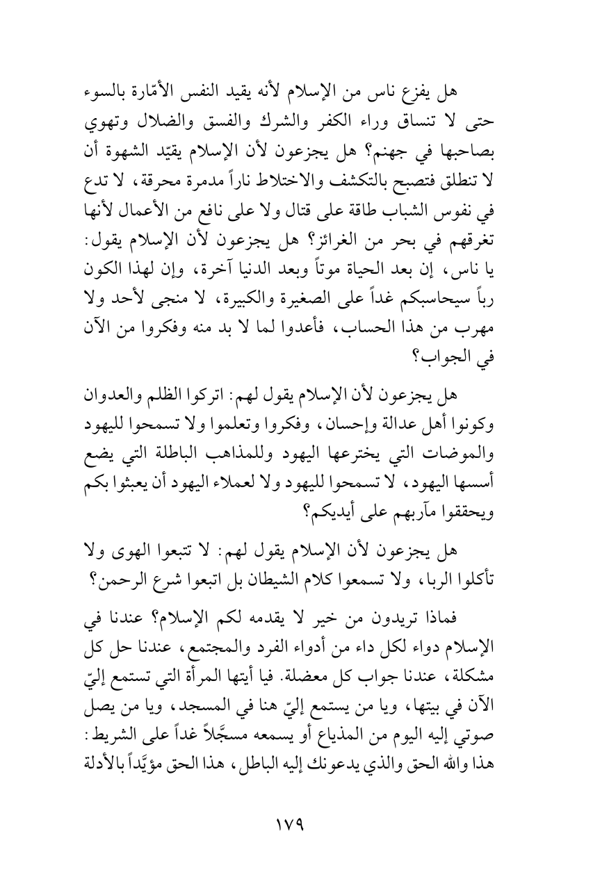 فماذا تريدون من خير لا يقدمه لكم الإسلام؟ عندنا في الإسلام دواء لكل داء من أدواء الفرد والمجتمع، عندنا حل كل مشكلة، عندنا جواب كل معضلة. فيا أيتها المرأة التي تستمع إليّ الآن في بيتها، ويا من يستمع إليّ هنا في المسجد، ويا من يصل صوتي إليه اليوم من المذياع أو يسمعه مسجَّلاً غداً على الشريط: هذا والله الحق والذي يدعونك إليه الباطل، هذا الحق مؤيَّداً بالأدلة