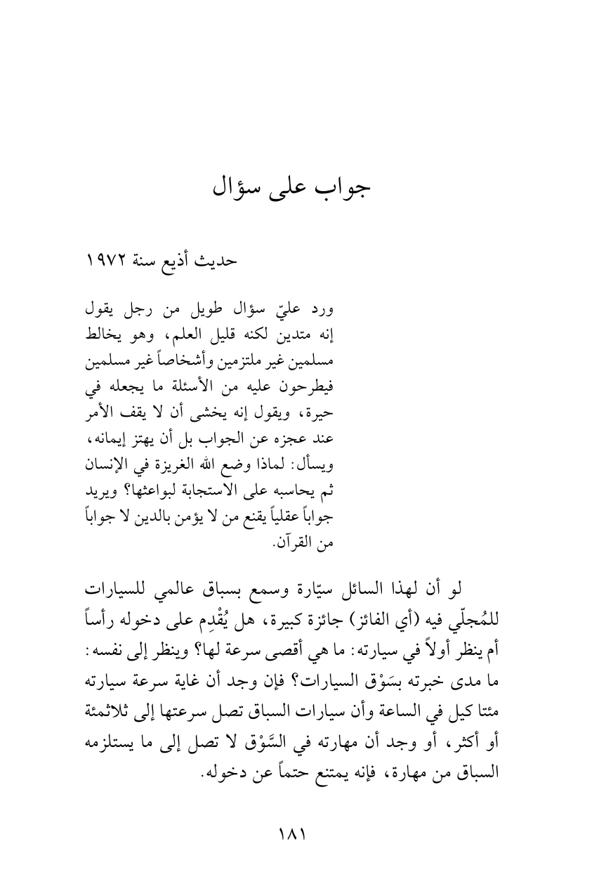 [ورد عليّ سؤال طويل من رجل يقول إنه متدين لكنه قليل العلم، وهو يخالط مسلمين غير ملتزمين وأشخاصاً غير مسلمين فيطرحون عليه من الأسئلة ما يجعله في حيرة، ويقول إنه يخشى أن لا يقف الأمر عند عجزه عن الجواب بل أن يهتز إيمانه، ويسأل: لماذا وضع الله الغريزة في الإنسان ثم يحاسبه على الاستجابة لبواعثها؟ ويريد جواباً عقلياً يقنع من لا يؤمن بالدين لا جواباً من القرآن.]