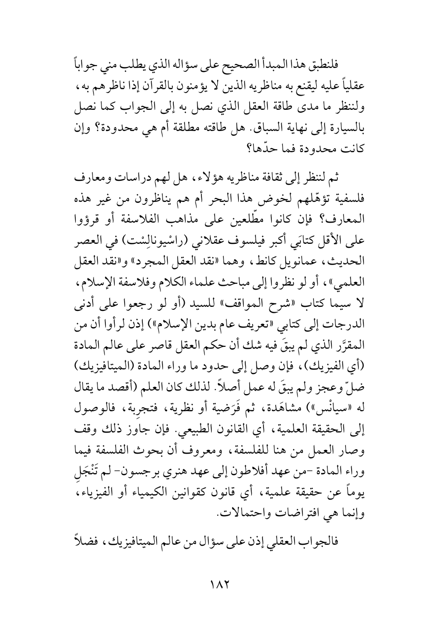 ثم لننظر إلى ثقافة مناظريه هؤلاء، هل لهم دراسات ومعارف فلسفية تؤهّلهم لخوض هذا البحر أم هم يناظرون من غير هذه المعارف؟ فإن كانوا مطّلعين على مذاهب الفلاسفة أو قرؤوا على الأقل كتابَي أكبر فيلسوف عقلاني (راسْيونالِسْت) في العصر الحديث، عمانويل كانط، وهما «نقد العقل المجرد» و «نقد العقل العلمي»، أو لو نظروا إلى مباحث علماء الكلام وفلاسفة الإسلام، لا سيما كتاب «شرح المواقف» للسيد (أو لو رجعوا على أدنى الدرجات إلى كتابي «تعريف عام بدين الإسلام») إذن لرأوا أن من المقرَّر الذي لم يبقَ فيه شك أن حكم العقل قاصر على عالم المادة (أي الفيزيك)، فإن وصل إلى حدود ما وراء المادة (الميتافيزيك) ضلّ وعجز ولم يبقَ له عمل أصلاً. لذلك كان العلم (أقصد ما يقال له «سيانْس») مشاهَدة، ثم فَرَضية أو نظرية، فتجرِبة، فالوصول إلى الحقيقة العلمية، أي القانون الطبيعي. فإن جاوز ذلك وقف وصار العمل من هنا للفلسفة، ومعروف أن بحوث الفلسفة فيما وراء المادة -من عهد أفلاطون إلى عهد هنري برجسون- لم تَنْجَلِ يوماً عن حقيقة علمية، أي قانون كقوانين الكيمياء أو الفيزياء، وإنما هي افتراضات واحتمالات.