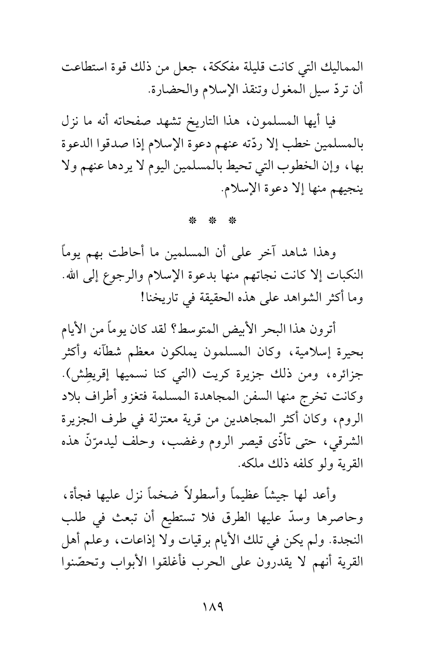 وهذا شاهد آخر على أن المسلمين ما أحاطت بهم يوماً النكبات إلا كانت نجاتهم منها بدعوة الإسلام والرجوع إلى الله. وما أكثر الشواهد على هذه الحقيقة في تاريخنا!
