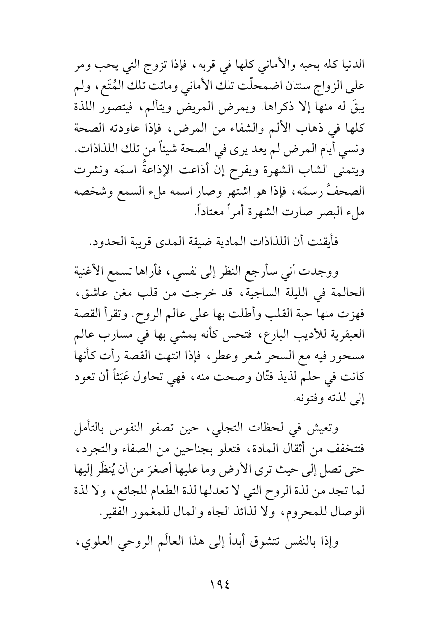 وتعيش في لحظات التجلي، حين تصفو النفوس بالتأمل فتتخفف من أثقال المادة، فتعلو بجناحين من الصفاء والتجرد، حتى تصل إلى حيث ترى الأرض وما عليها أصغرَ من أن يُنظَر إليها لما تجد من لذة الروح التي لا تعدلها لذة الطعام للجائع، ولا لذة الوصال للمحروم، ولا لذائذ الجاه والمال للمغمور الفقير.