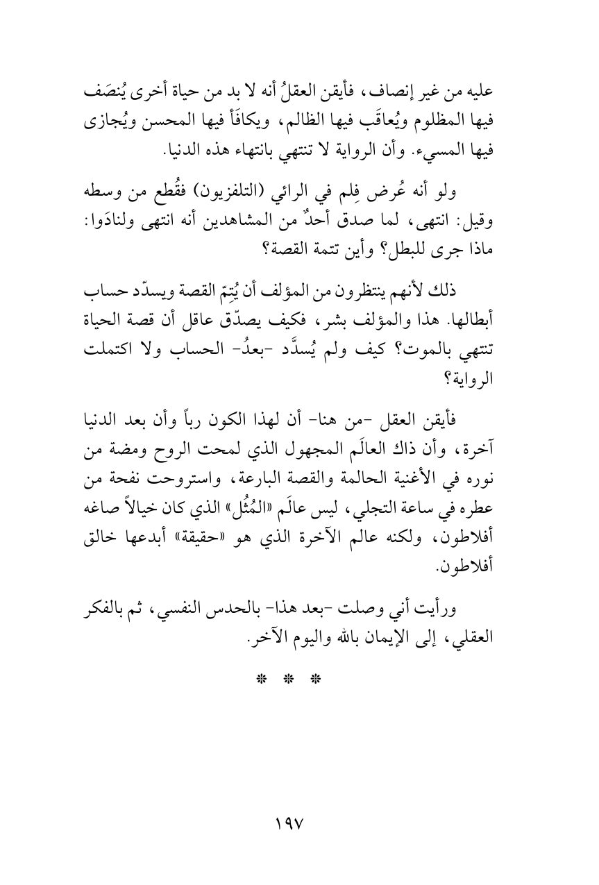 فأيقن العقل -من هنا- أن لهذا الكون رباً وأن بعد الدنيا آخرة، وأن ذاك العالَم المجهول الذي لمحت الروح ومضة من نوره في الأغنية الحالمة والقصة البارعة، واستروحت نفحة من عطره في ساعة التجلي، ليس عالَم «المُثُل» الذي كان خيالاً صاغه أفلاطون، ولكنه عالم الآخرة الذي هو «حقيقة» أبدعها خالق أفلاطون.