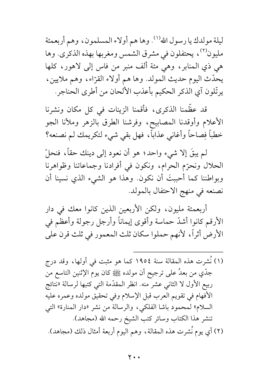 (¬1) نُشرت هذه المقالة سنة 1954 كما هو مثبت في أولها، وقد درج جدّي من بعدُ على ترجيح أن مولده صلى الله عليه وسلم كان يوم الإثنين التاسع من ربيع الأول لا الثاني عشر منه. انظر المقدّمة التي كتبها لرسالة «نتائج الأفهام في تقويم العرب قبل الإسلام وفي تحقيق مولده وعمره عليه السلام» لمحمود باشا الفلكي، والرسالة من نشر «دار المنارة» التي تنشر هذا الكتاب وسائر كتب الشيخ رحمه الله (مجاهد).