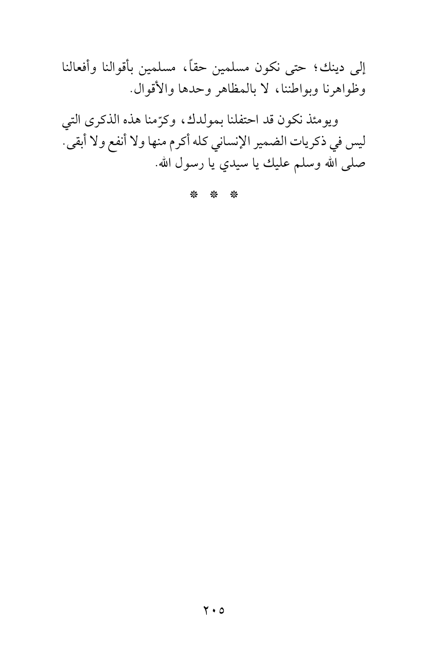 ويومئذ نكون قد احتفلنا بمولدك، وكرّمنا هذه الذكرى التي ليس في ذكريات الضمير الإنساني كله أكرم منها ولا أنفع ولا أبقى. صلى الله وسلم عليك يا سيدي يا رسول الله.