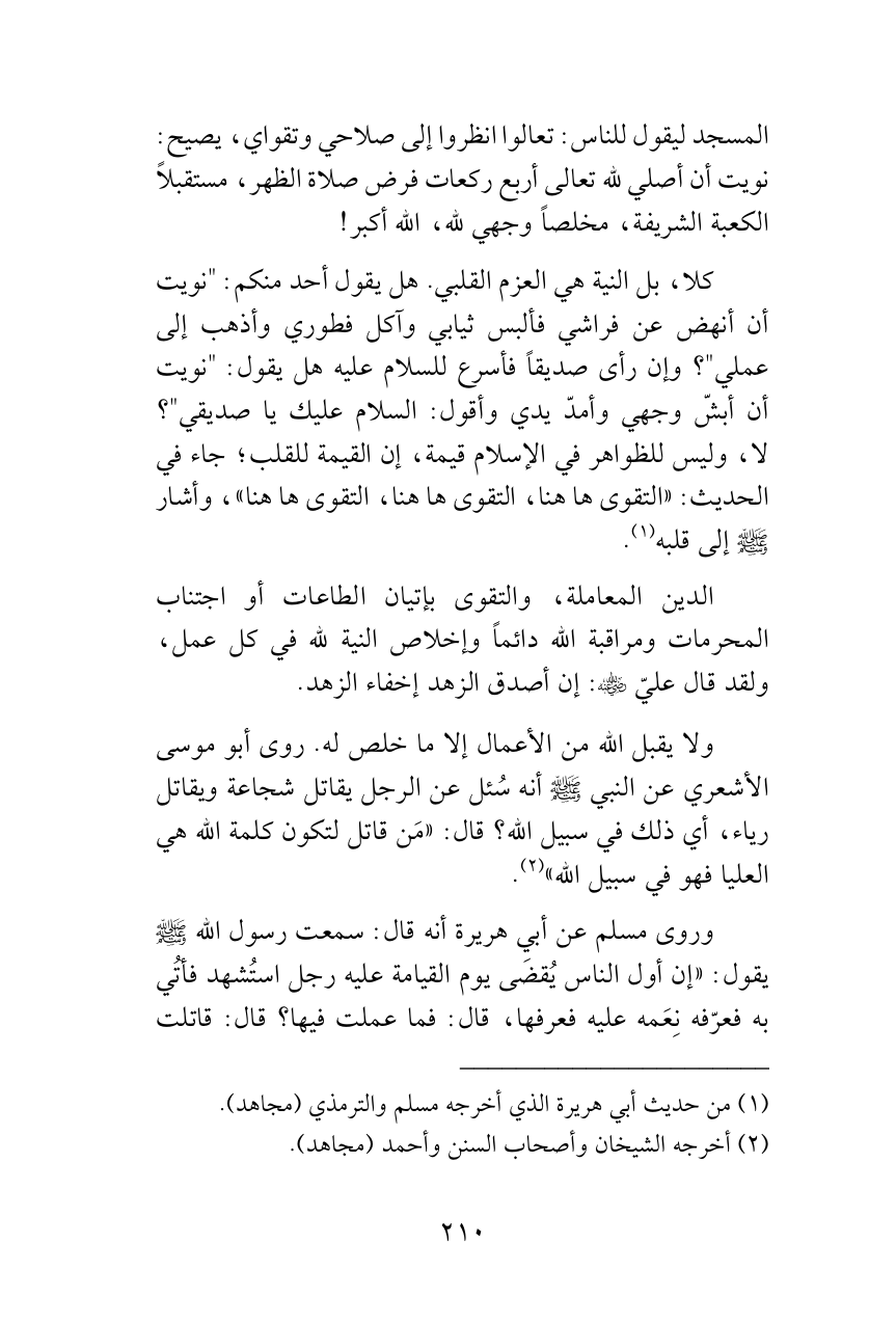 المسجد ليقول للناس: تعالوا انظروا إلى صلاحي وتقواي، يصيح: نويت أن أصلي لله تعالى أربع ركعات فرض صلاة الظهر، مستقبلاً الكعبة الشريفة، مخلصاً وجهي لله، الله أكبر!