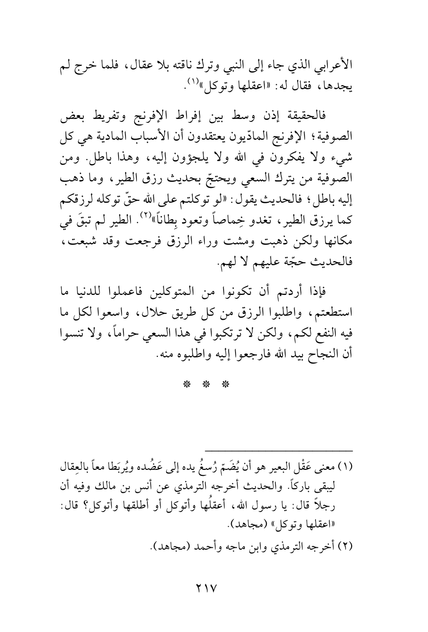 فالحقيقة إذن وسط بين إفراط الإفرنج وتفريط بعض الصوفية؛ الإفرنج المادّيون يعتقدون أن الأسباب المادية هي كل شيء ولا يفكرون في الله ولا يلجؤون إليه، وهذا باطل. ومن الصوفية من يترك السعي ويحتجّ بحديث رزق الطير، وما ذهب إليه باطل؛ فالحديث يقول: «لو توكلتم على الله حقّ توكله لرزقكم كما يرزق الطير، تغدو خِماصاً وتعود بِطاناً» (¬2). الطير لم تبقَ في مكانها ولكن ذهبت ومشت وراء الرزق فرجعت وقد شبعت، فالحديث حجّة عليهم لا لهم.
