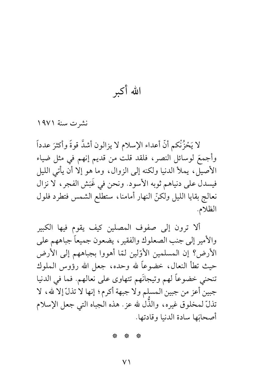 لا يَحْزُنْكم أنّ أعداء الإسلام لا يزالون أشدَّ قوةً وأكثرَ عدداً وأجمعَ لوسائل النصر، فلقد قلت من قديم إنهم في مثل ضياء الأصيل، يملأ الدنيا ولكنه إلى الزوال، وما هو إلا أن يأتي الليل فيسدل على دنياهم ثوبه الأسود. ونحن في غَبَش الفجر، لا نزال نعالج بقايا الليل ولكنّ النهار أمامنا، ستطلع الشمس فتطرد فلول الظلام.