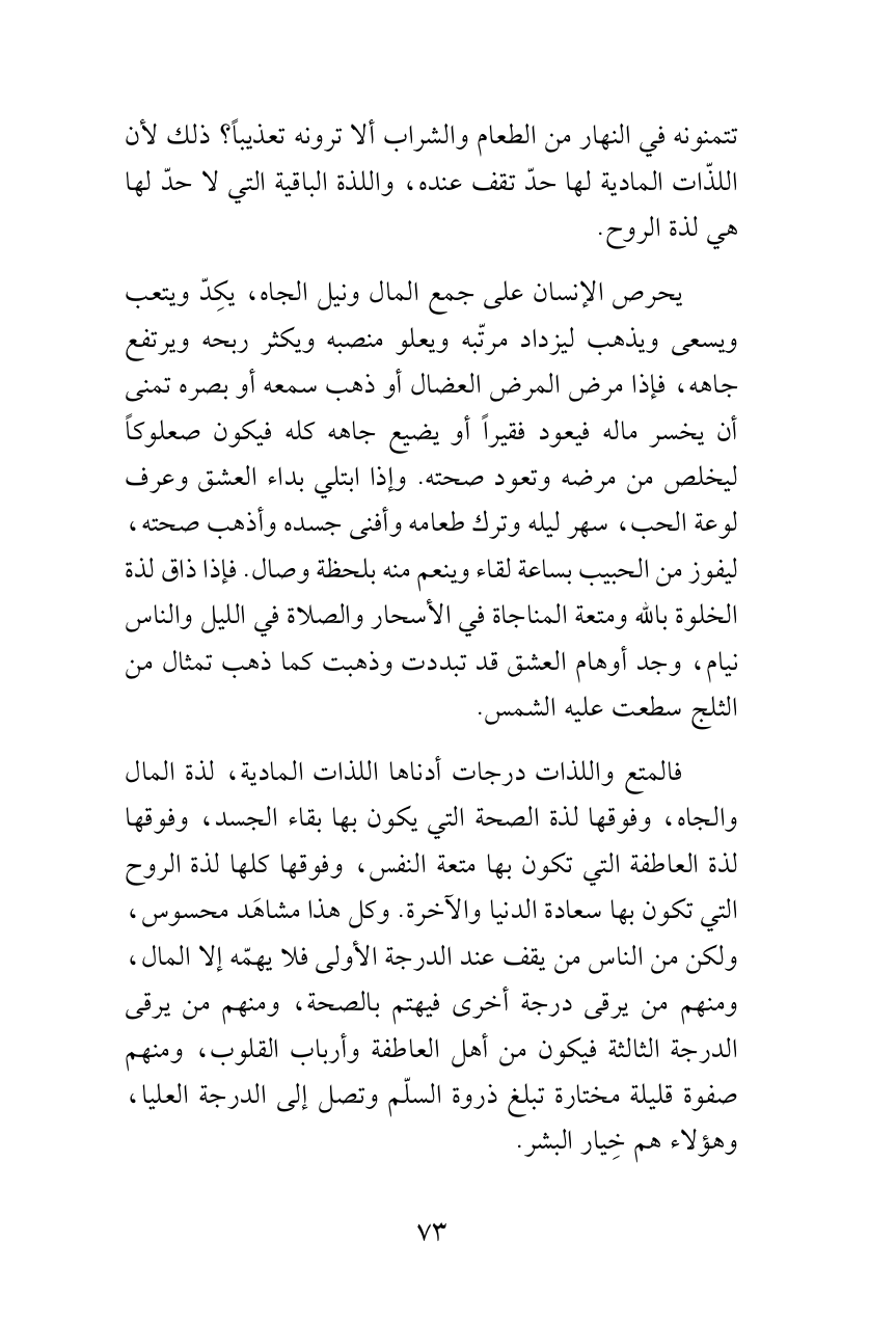 فالمتع واللذات درجات أدناها اللذات المادية، لذة المال والجاه، وفوقها لذة الصحة التي يكون بها بقاء الجسد، وفوقها لذة العاطفة التي تكون بها متعة النفس، وفوقها كلها لذة الروح التي تكون بها سعادة الدنيا والآخرة. وكل هذا مشاهَد محسوس، ولكن من الناس من يقف عند الدرجة الأولى فلا يهمّه إلا المال، ومنهم من يرقى درجة أخرى فيهتم بالصحة، ومنهم من يرقى الدرجة الثالثة فيكون من أهل العاطفة وأرباب القلوب، ومنهم صفوة قليلة مختارة تبلغ ذروة السلّم وتصل إلى الدرجة العليا، وهؤلاء هم خِيار البشر.