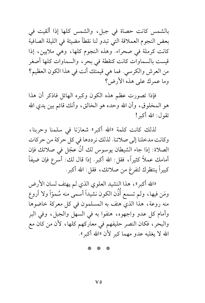 بالشمس كانت حصاة في جبل، والشمس كلها إذا ألقيت في بعض النجوم العملاقة التي تبدو لنا نقطاً مضيئة في الليلة الصافية كانت كرملة في صحراء. وهذه النجوم كلها، وهي ملايين، إذا قيست بالسماوات كانت كنقطة في بحر، والسماوات كلها أصغر من العرش والكرسي. فما هي قيمتك أنت في هذا الكون العظيم؟ وما عمرك على هذه الأرض؟