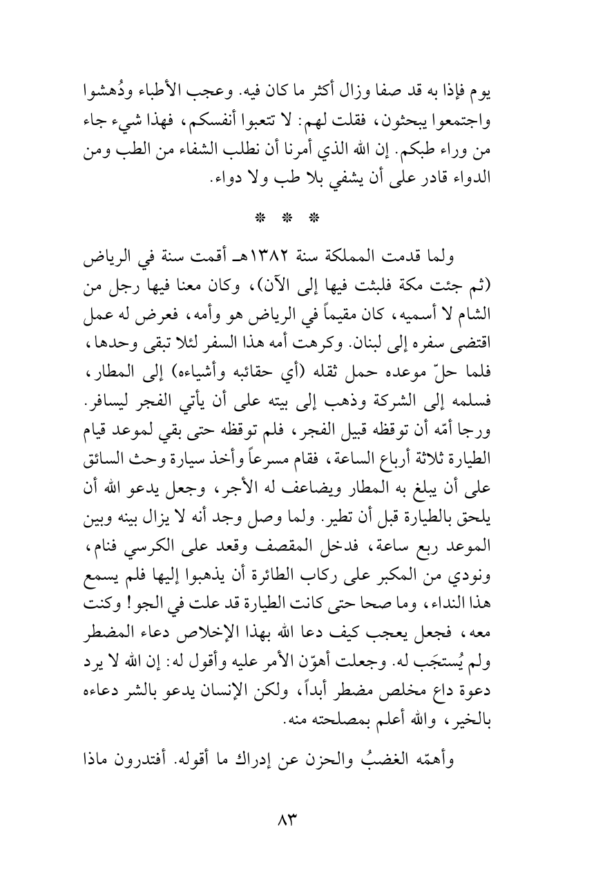 ولما قدمت المملكة سنة 1382هـ أقمت سنة في الرياض (ثم جئت مكة فلبثت فيها إلى الآن)، وكان معنا فيها رجل من الشام لا أسميه، كان مقيماً في الرياض هو وأمه، فعرض له عمل اقتضى سفره إلى لبنان. وكرهت أمه هذا السفر لئلا تبقى وحدها، فلما حلّ موعده حمل ثقله (أي حقائبه وأشياءه) إلى المطار، فسلمه إلى الشركة وذهب إلى بيته على أن يأتي الفجر ليسافر. ورجا أمّه أن توقظه قبيل الفجر، فلم توقظه حتى بقي لموعد قيام الطيارة ثلاثة أرباع الساعة، فقام مسرعاً وأخذ سيارة وحث السائق على أن يبلغ به المطار ويضاعف له الأجر، وجعل يدعو الله أن يلحق بالطيارة قبل أن تطير. ولما وصل وجد أنه لا يزال بينه وبين الموعد ربع ساعة، فدخل المقصف وقعد على الكرسي فنام، ونودي من المكبر على ركاب الطائرة أن يذهبوا إليها فلم يسمع هذا النداء، وما صحا حتى كانت الطيارة قد علت في الجو! وكنت معه، فجعل يعجب كيف دعا الله بهذا الإخلاص دعاء المضطر ولم يُستجَب له. وجعلت أهوّن الأمر عليه وأقول له: إن الله لا يرد دعوة داع مخلص مضطر أبداً، ولكن الإنسان يدعو بالشر دعاءه بالخير، والله أعلم بمصلحته منه.