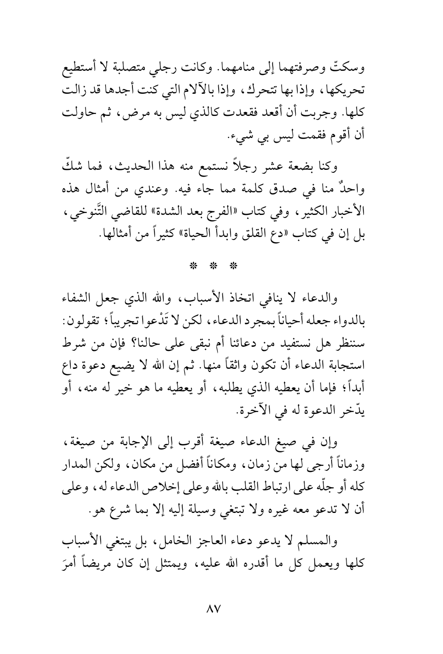 وسكتّ وصرفتهما إلى منامهما. وكانت رجلي متصلبة لا أستطيع تحريكها، وإذا بها تتحرك، وإذا بالآلام التي كنت أجدها قد زالت كلها. وجربت أن أقعد فقعدت كالذي ليس به مرض، ثم حاولت أن أقوم فقمت ليس بي شيء.
