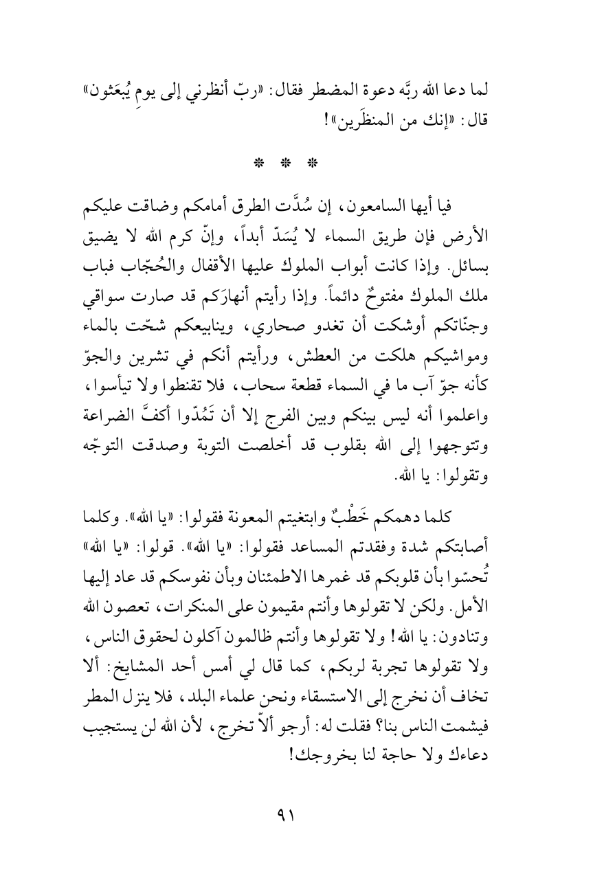 فيا أيها السامعون، إن سُدَّت الطرق أمامكم وضاقت عليكم الأرض فإن طريق السماء لا يُسَدّ أبداً، وإنّ كرم الله لا يضيق بسائل. وإذا كانت أبواب الملوك عليها الأقفال والحُجّاب فباب ملك الملوك مفتوحٌ دائماً. وإذا رأيتم أنهارَكم قد صارت سواقي وجنّاتكم أوشكت أن تغدو صحاري، وينابيعكم شحّت بالماء ومواشيكم هلكت من العطش، ورأيتم أنكم في تشرين والجوّ كأنه جوّ آب ما في السماء قطعة سحاب، فلا تقنطوا ولا تيأسوا، واعلموا أنه ليس بينكم وبين الفرج إلا أن تَمُدّوا أكفَّ الضراعة وتتوجهوا إلى الله بقلوب قد أخلصت التوبة وصدقت التوجّه وتقولوا: يا الله.