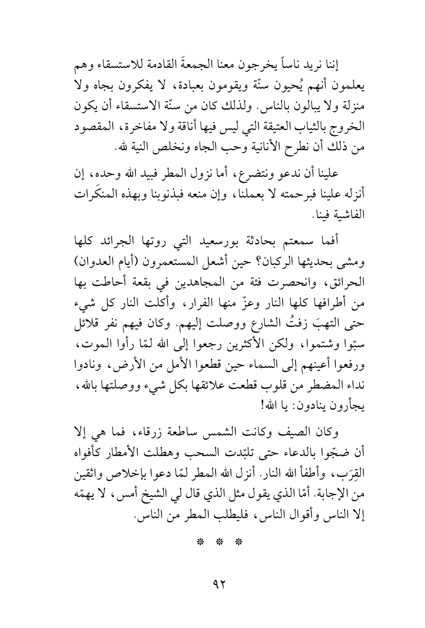 إننا نريد ناساً يخرجون معنا الجمعةَ القادمة للاستسقاء وهم يعلمون أنهم يُحيون سنّة ويقومون بعبادة، لا يفكرون بجاه ولا منزلة ولا يبالون بالناس. ولذلك كان من سنّة الاستسقاء أن يكون الخروج بالثياب العتيقة التي ليس فيها أناقة ولا مفاخرة، المقصود من ذلك أن نطرح الأنانية وحب الجاه ونخلص النية لله.