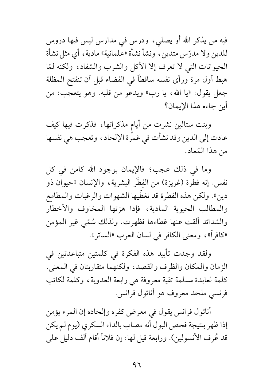 فيه من يذكر الله أو يصلي، ودرس في مدارس ليس فيها دروس للدين ولا مدرّس متدين، ونشأ نشأة «علمانية» مادية، أي مثل نشأة الحيوانات التي لا تعرف إلا الأكل والشرب والسّفاد، ولكنه لمّا هبط أول مرة ورأى نفسه ساقطاً في الفضاء قبل أن تنفتح المظلة جعل يقول: «يا الله، يا رب» ويدعو من قلبه. وهو يتعجب: من أين جاءه هذا الإيمان؟