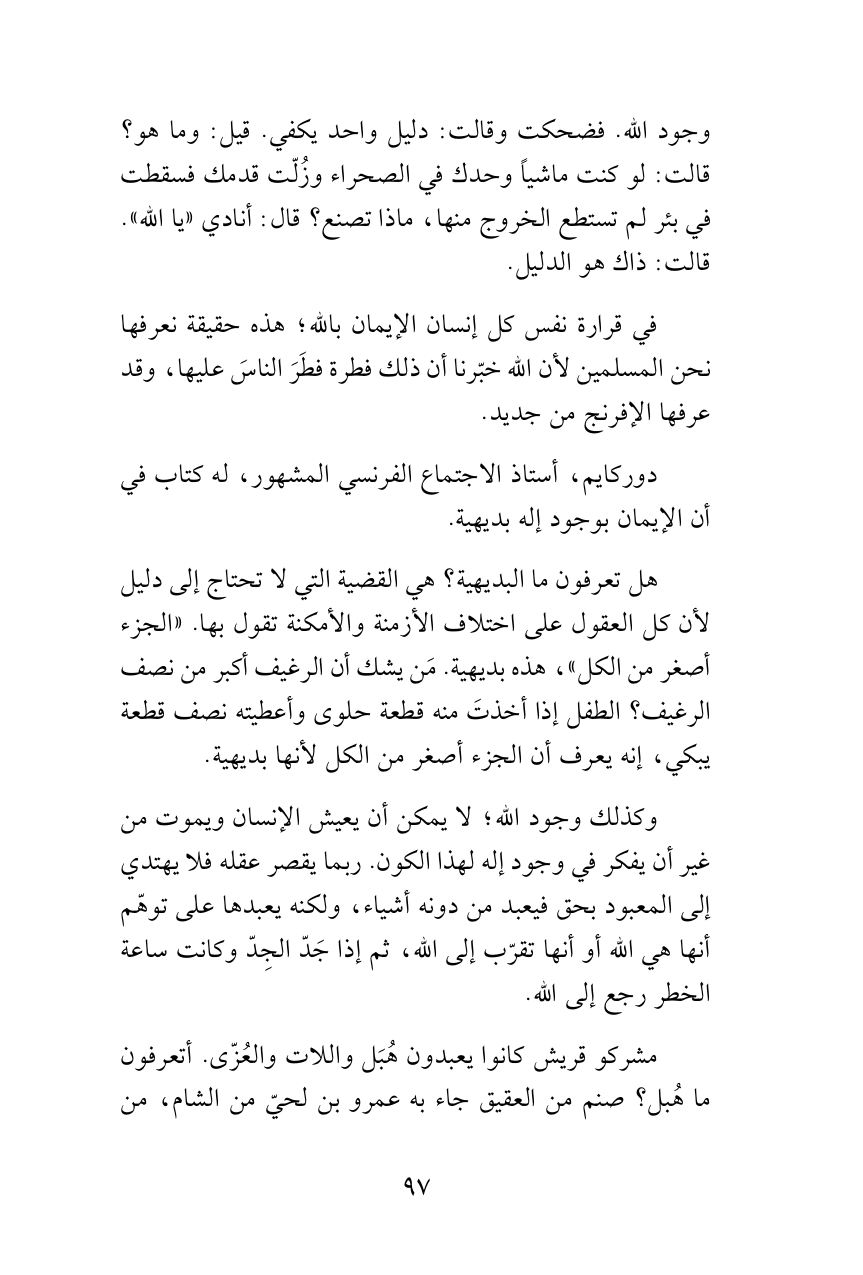 وجود الله. فضحكت وقالت: دليل واحد يكفي. قيل: وما هو؟ قالت: لو كنت ماشياً وحدك في الصحراء وزُلّت قدمك فسقطت في بئر لم تستطع الخروج منها، ماذا تصنع؟ قال: أنادي «يا الله». قالت: ذاك هو الدليل.