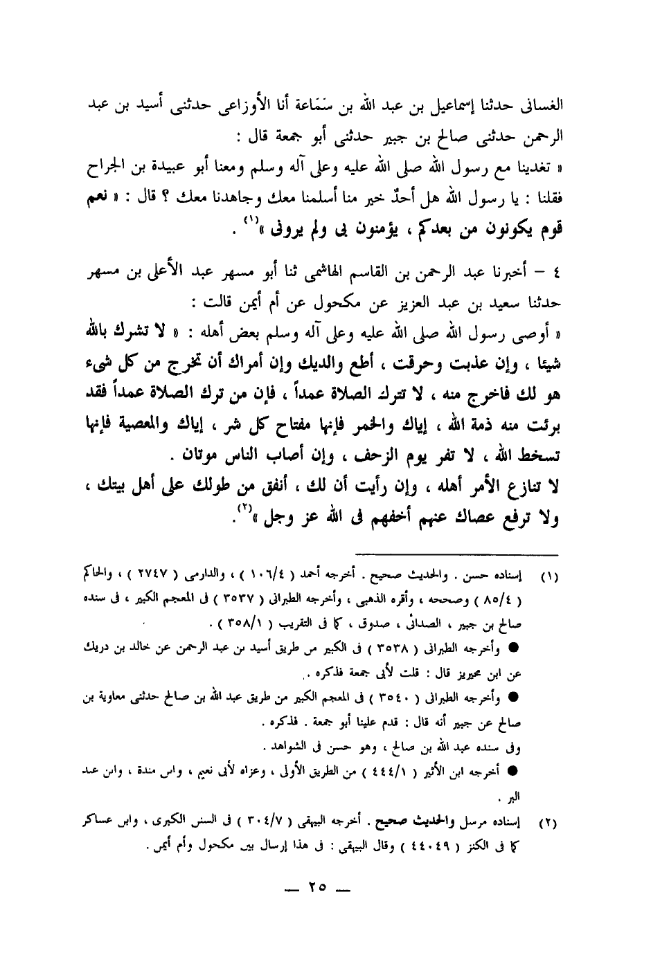 4 - أَخْبَرَنَا عَبْدُ الرَّحْمَنِ بْنُ الْقَاسِمِ الْهَاشِمِيُّ ثنا أَبُو مِسْهِرٍ عَبْدُ الْأَعْلَى بْنُ مِسْهِرٍ الْغَسَّانِيُّ، حَدَّثَنَا سَعِيدُ بْنُ عَبْدِ الْعَزِيزِ، عَنْ مَكْحُولٍ، عَنْ أُمِّ أَيْمَنَ قَالَتْ: أَوْصَى رَسُولُ اللَّهِ صَلَّى اللَّهُ عَلَيْهِ وَعَلَى آلِهِ وَسَلَّمَ بَعْضَ أَهْلِهِ: «§لَا تُشْرِكْ بِاللَّهِ شَيْئًا وَإِنْ عُذِّبْتَ وَحُرِّقْتَ، أَطِعْ وَالِدَيْكَ وَإِنْ أَمَرَاكَ أَنْ تَخْرُجَ مِنْ كُلِّ شَيْءٍ هُوَ لَكَ فَاخْرُجْ مِنْهُ، لَا تَتْرُكِ الصَّلَاةَ عَمْدًا، فَإِنَّ مَنْ تَرَكَ الصَّلَاةَ عَمْدًا فَقَدْ بَرِئَتْ مِنْهُ ذَمَّةُ اللَّهِ، إِيَّاكَ وَالْخَمْرَ فَإِنَّهَا مِفْتَاحُ كُلِّ شَرٍّ، إِيَّاكَ وَالْمَعْصِيَةَ فَإِنَّهَا تُسْخِطُ اللَّهَ، لَا تَفِرَّ يَوْمَ الزَّحْفِ، وَإِنْ أَصَابَ النَّاسَ مَوْتَانِ، لَا تُنَازِعِ الْأَمْرَ أَهْلَهُ، وَإِنْ رَأَيْتَ أَنْ لَكَ، أَنْفِقْ مِنْ طَوْلِكَ عَلَى أَهْلِ بَيْتِكَ، وَلَا تَرْفَعْ عَصَاكَ عَنْهُمْ، أَخِفْهُمْ فِي اللَّهِ عَزَّ وَجَلَّ»