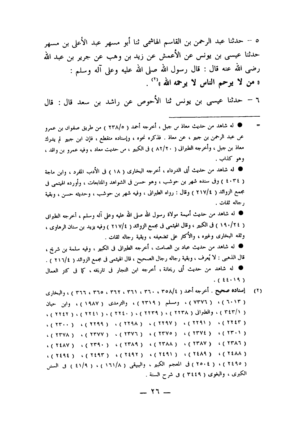 5 - حَدَّثَنَا عَبْدُ الرَّحْمَنِ بْنُ الْقَاسِمِ الْهَاشِمِيُّ ثنا أَبُو مِسْهِرٍ عَبْدُ الْأَعْلَى بْنُ مِسْهِرٍ الْغَسَّانِيُّ، حَدَّثَنَا عِيسَى بْنُ يُونُسَ، عَنِ الْأَعْمَشِ، عَنْ زَيْدِ بْنِ وَهْبٍ، عَنْ جَرِيرِ بْنِ عَبْدِ اللَّهِ رَضِيَ اللَّهُ عَنْهُ قَالَ: قَالَ رَسُولُ اللَّهِ صَلَّى اللَّهُ عَلَيْهِ وَعَلَى آلِهِ وَسَلَّمَ: «§مَنْ لَا يَرْحَمِ النَّاسَ لَا يَرْحَمْهُ اللَّهُ»