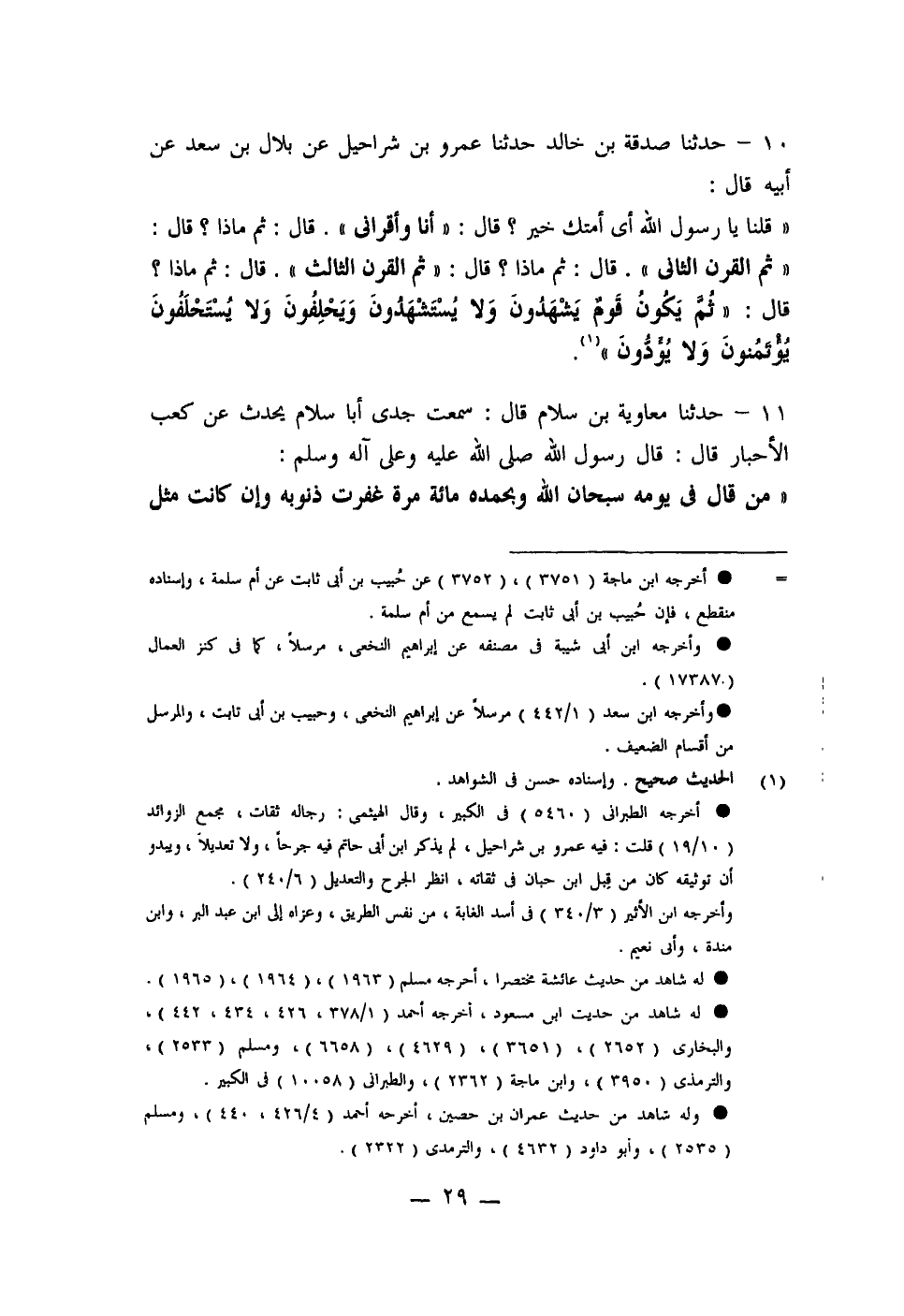 11 - حَدَّثَنَا مُعَاوِيَةُ بْنُ سَلَّامٍ، قَالَ: سَمِعْتُ جَدِّي أَبَا سَلَّامٍ، يُحَدِّثُ عَنْ كَعْبِ الْأَحْبَارِ قَالَ: قَالَ رَسُولُ اللَّهِ صَلَّى اللَّهُ عَلَيْهِ وَعَلَى آلِهِ وَسَلَّمَ: «§مَنْ قَالَ فِي يَوْمِهِ سُبْحَانَ اللَّهِ وَبِحَمْدِهِ مِائَةَ مَرَّةٍ غُفِرَتْ ذُنُوبُهُ وَإِنْ كَانَتْ مِثْلَ زَبَدِ الْبَحْرِ»