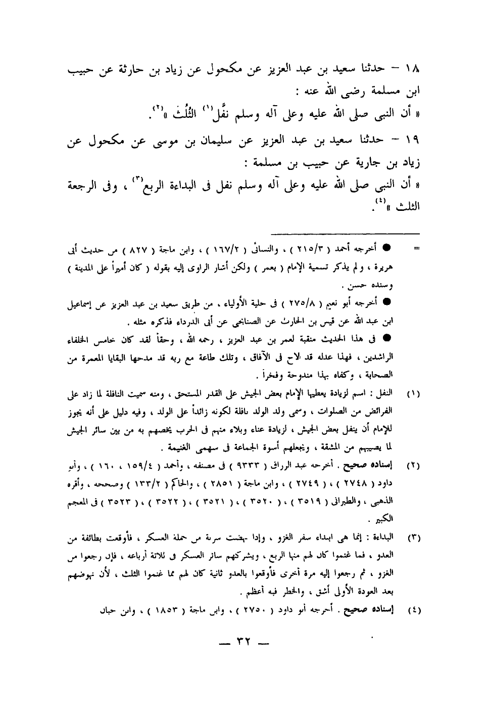 19 - حَدَّثَنَا سَعِيدُ بْنُ عَبْدِ الْعَزِيزِ، عَنْ سُلَيْمَانَ بْنِ مُوسَى، عَنْ مَكْحُولٍ، عَنْ زِيَادِ بْنِ جَارِيَةَ، عَنْ حَبِيبِ بْنِ مَسْلَمَةَ، §أَنَّ النَّبِيَّ صَلَّى اللَّهُ عَلَيْهِ وَعَلَى آلِهِ وَسَلَّمَ نَفَّلَ فِي الْبَدَاءَةِ الرُّبُعَ، وَفِي الرَّجْعَةِ الثُّلُثَ
