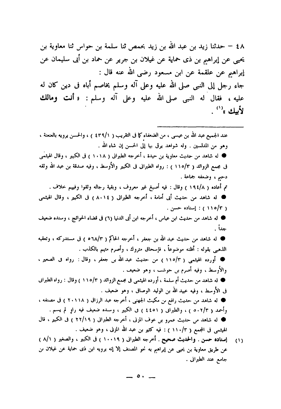 48 - حَدَّثَنَا زَيْدُ بْنُ عَبْدِ اللَّهِ بْنِ زَيْدٍ، بِحِمْصَ، ثنا سَلَمَةُ بْنُ جَوَّاسٍ، ثنا مُعَاوِيَةُ بْنُ يَحْيَى، عَنْ إِبْرَاهِيمَ بْنِ ذِي حِمَايَةَ عَنْ غَيْلَانَ بْنِ جَرِيرٍ، عَنْ حَمَّادِ بْنِ أَبِي سُلَيْمَانَ، عَنْ إِبْرَاهِيمَ، عَنْ عَلْقَمَةَ، عَنِ ابْنِ مَسْعُودٍ رَضِيَ اللَّهُ عَنْهُ قَالَ: جَاءَ رَجُلٌ إِلَى النَّبِيِّ صَلَّى اللَّهُ عَلَيْهِ وَعَلَى آلِهِ وَسَلَّمَ يُخَاصِمُ أَبَاهُ فِي دَيْنٍ كَانَ لَهُ عَلَيْهِ فَقَالَ لَهُ النَّبِيُّ صَلَّى اللَّهُ عَلَيْهِ وَعَلَى آلِهِ وَسَلَّمَ: «§أَنْتَ وَمَالُكَ لِأَبِيكَ»