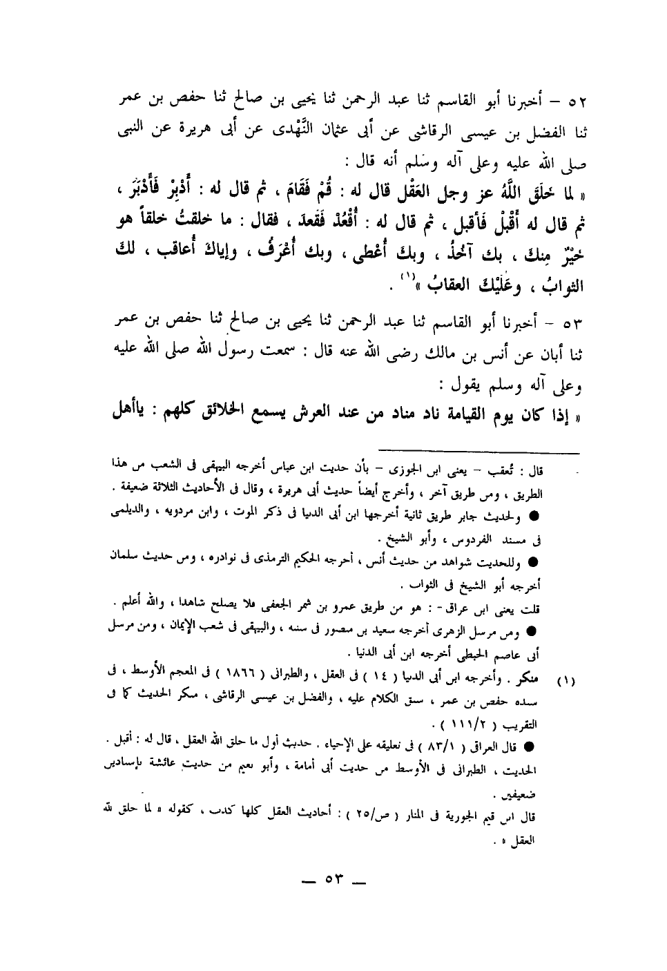 52 - أَخْبَرَنَا أَبُو الْقَاسِمِ، ثنا عَبْدُ الرَّحْمَنِ، ثنا يَحْيَى بْنُ صَالِحٍ، ثنا حَفْصُ بْنُ عُمَرَ، ثنا الْفَضْلُ بْنُ عِيسَى الرَّقَاشِيُّ، عَنْ أَبِي عُثْمَانَ النَّهْدِيِّ، عَنْ أَبِي هُرَيْرَةَ، عَنِ النَّبِيِّ صَلَّى اللَّهُ عَلَيْهِ وَعَلَى آلِهِ وَسَلَّمَ أَنَّهُ قَالَ: " §لَمَّا خَلَقَ اللَّهُ عَزَّ وَجَلَّ الْعَقْلَ قَالَ لَهُ: قُمْ، فَقَامَ، ثُمَّ قَالَ لَهُ: أَدْبِرْ، فَأَدْبَرَ، ثُمَّ قَالَ لَهُ: أَقْبِلْ، فَأَقْبَلَ، ثُمَّ قَالَ لَهُ: اقْعُدْ، فَقَعَدَ، فَقَالَ: مَا خَلَقْتُ خَلْقًا هُوَ خَيْرٌ مِنْكَ، بِكَ آخُذُ، وَبِكَ أُعْطِي، وَبِكَ أُعْرَفُ، وَإِيَّاكَ أُعَاقِبُ، لَكَ الثَّوَابُ وَعَلَيْكَ الْعِقَابُ "
