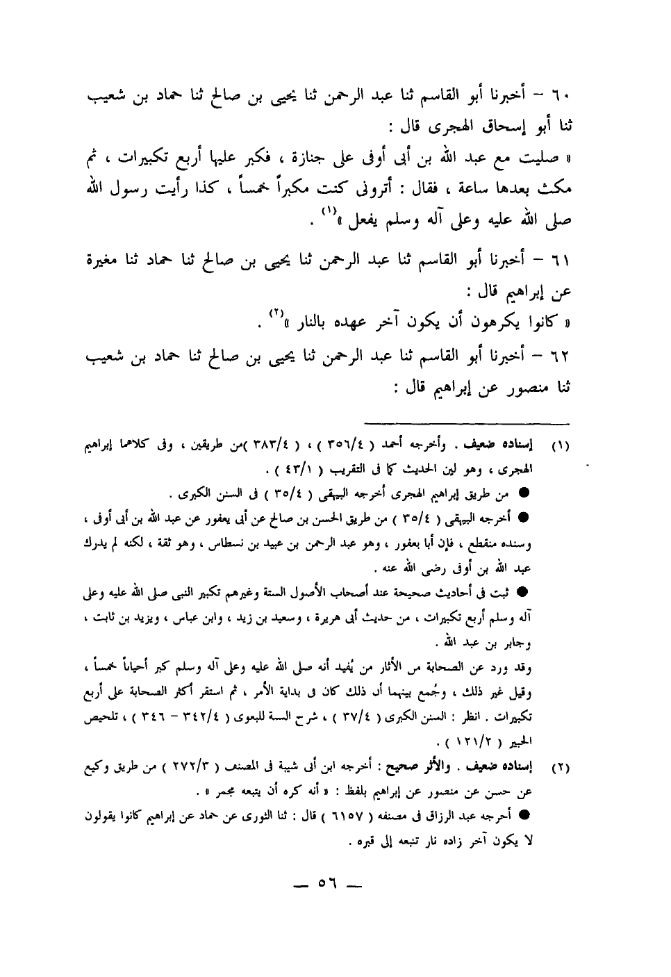 60 - أَخْبَرَنَا أَبُو الْقَاسِمِ، ثنا عَبْدُ الرَّحْمَنِ، ثنا يَحْيَى بْنُ صَالِحٍ، ثنا حَمَّادُ بْنُ شُعَيْبٍ، ثنا أَبُو إِسْحَاقَ الْهَجَرِيُّ قَالَ: §صَلَّيْتُ مَعَ عَبْدِ اللَّهِ بْنِ أَبِي أَوْفَى عَلَى جِنَازَةٍ، فَكَبَّرَ عَلَيْهَا أَرْبَعَ تَكْبِيرَاتٍ ثُمَّ مَكَثَ بَعْدَهَا سَاعَةً فَقَالَ: «أَتُرَوْنِي كُنْتُ مُكَبِّرًا خَمْسًا، كَذَا رَأَيْتُ رَسُولَ اللَّهِ صَلَّى اللَّهُ عَلَيْهِ وَعَلَى آلِهِ وَسَلَّمَ يَفْعَلُ»