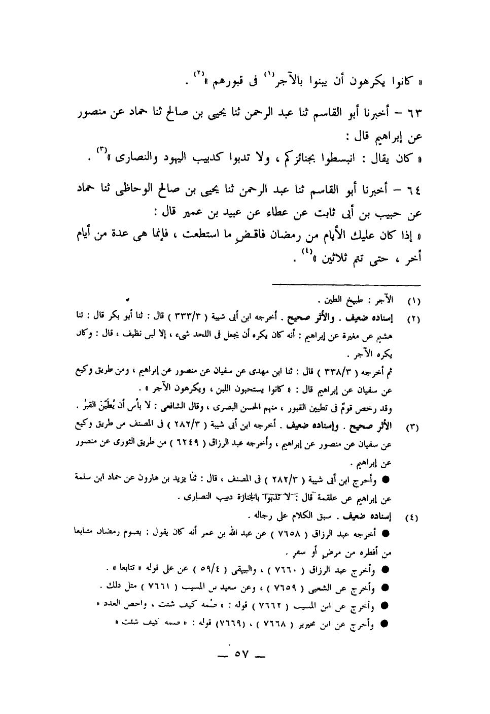 63 - أَخْبَرَنَا أَبُو الْقَاسِمِ، ثنا عَبْدُ الرَّحْمَنِ، ثنا يَحْيَى بْنُ صَالِحٍ، ثنا حَمَّادٌ، عَنْ مَنْصُورٍ، عَنْ إِبْرَاهِيمَ قَالَ: «§كَانَ يُقَالُ انْبَسِطُوا بِجَنَائِزِكُمْ، وَلَا تَدِبُّوا كَدَبِيبِ الْيَهُودِ وَالنَّصَارَى»