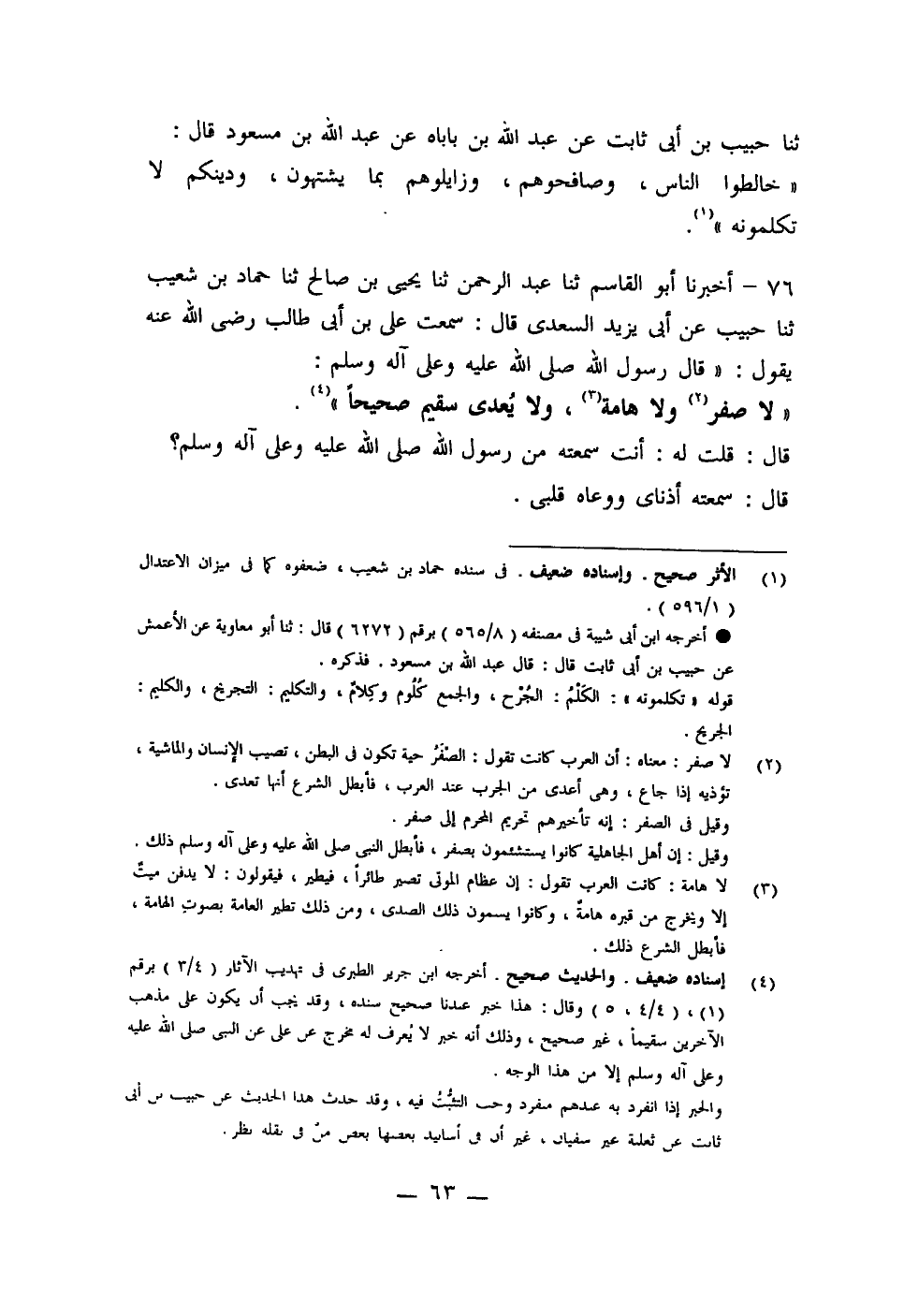 76 - أَخْبَرَنَا أَبُو الْقَاسِمِ، ثنا عَبْدُ الرَّحْمَنِ، ثنا يَحْيَى بْنُ صَالِحٍ، ثنا حَمَّادُ بْنُ شُعَيْبٍ، ثنا حَبِيبٌ، عَنْ أَبِي يَزِيدَ السَّعْدِيِّ قَالَ: سَمِعْتُ عَلِيَّ بْنَ أَبِي طَالِبٍ رَضِيَ اللَّهُ عَنْهُ يَقُولُ: قَالَ رَسُولُ اللَّهِ صَلَّى اللَّهُ عَلَيْهِ وَعَلَى آلِهِ وَسَلَّمَ: «§لَا صَفَرَ وَلَا هَامَةَ وَلَا يُعْدِي سَقِيمٌ صَحِيحًا» . قَالَ: قُلْتُ لَهُ: أَنْتَ سَمِعْتَهُ مِنْ رَسُولِ اللَّهِ صَلَّى اللَّهُ عَلَيْهِ وَعَلَى آلِهِ وَسَلَّمَ؟ قَالَ: سَمِعَتْهُ أُذُنَايَ وَوَعَاهُ قَلْبِي