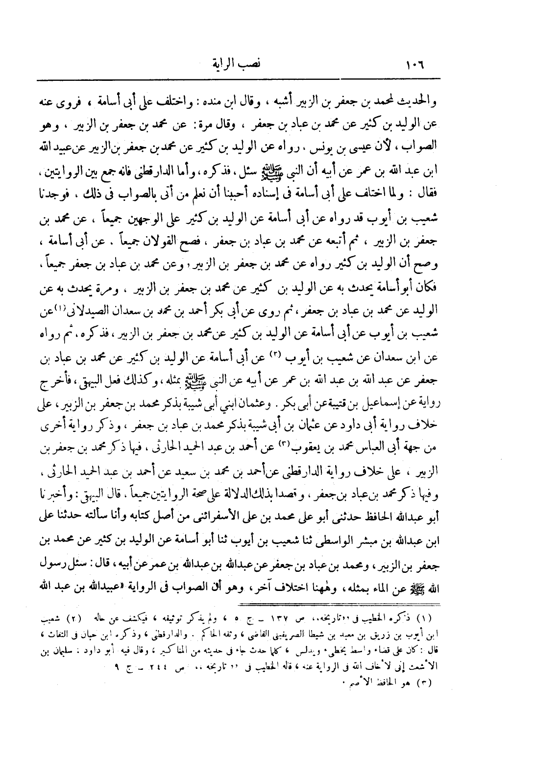وعثمان ابنا أَبِي شَيْبَةَ بِذِكْرِ مُحَمَّدِ بْنِ جَعْفَرِ بْنِ الزُّبَيْرِ، إلى خِلَافِ رِوَايَةِ أَبِي دَاوُد عَنْ عُثْمَانَ بْنِ أَبِي شَيْبَةَ بِذِكْرِ مُحَمَّدِ بْنِ عَبَّادِ بْنِ جَعْفَرٍ، وَذَكَرَ رِوَايَةً أُخْرَى مِنْ جِهَةِ أَبِي الْعَبَّاسِ مُحَمَّدِ بْنِ يَعْقُوبَ3 عَنْ أَحْمَدَ بْنِ عَبْدِ الْحَمِيدِ الْحَارِثِيِّ، فِيهَا ذِكْرُ مُحَمَّدِ بْنِ جَعْفَرِ بْنِ الزُّبَيْرِ، عَلَى خِلَافِ رِوَايَةِ الدَّارَقُطْنِيِّ عَنْ أَحْمَدَ بْنِ مُحَمَّدِ بْنِ سَعِيدٍ عَنْ أَحْمَدَ بْنِ عَبْدِ الْحَمِيدِ الْحَارِثِيِّ، وَفِيهَا ذِكْرُ مُحَمَّدِ بْنِ عَبَّادِ بْنِ جَعْفَرٍ، وَقَصَدَا بِذَلِكَ الدَّلَالَةَ عَلَى صِحَّةِ الرِّوَايَتَيْنِ جَمِيعًا، قَالَ الْبَيْهَقِيُّ: وَأَخْبَرَنَا أَبُو عَبْدِ اللَّهِ الْحَافِظُ حَدَّثَنِي أَبُو عَلِيٍّ مُحَمَّدُ بْنُ علي الاسفرائني مِنْ أَصْلِ كِتَابِهِ وَأَنَا سَأَلْته حَدَّثَنَا عَلِيُّ بْنُ عَبْدِ الْمَلِكِ بْنِ مُبَشِّرٍ الْوَاسِطِيُّ ثَنَا شُعَيْبُ بْنُ أَيُّوبَ ثَنَا أَبُو أُسَامَةَ الْوَلِيدُ بْنُ كَثِيرٍ عَنْ مُحَمَّدِ بْنِ جَعْفَرِ بْنِ الزُّبَيْرِ، وَمُحَمَّدِ بْنِ عَبَّادِ بْنِ جَعْفَرٍ عَنْ عَبْدِ اللَّهِ بْنِ عَبْدِ اللَّهِ بْنِ عُمَرَ عَنْ أَبِيهِ، قَالَ: سُئِلَ رَسُولُ اللَّهِ صَلَّى اللَّهُ عَلَيْهِ وَسَلَّمَ عن الماء بمثله، وههنا اخْتِلَافٌ آخَرُ، وَهُوَ أَنَّ الصَّوَابَ فِي الرِّوَايَةِ عُبَيْدُ الله بن عبد اللَّهِ