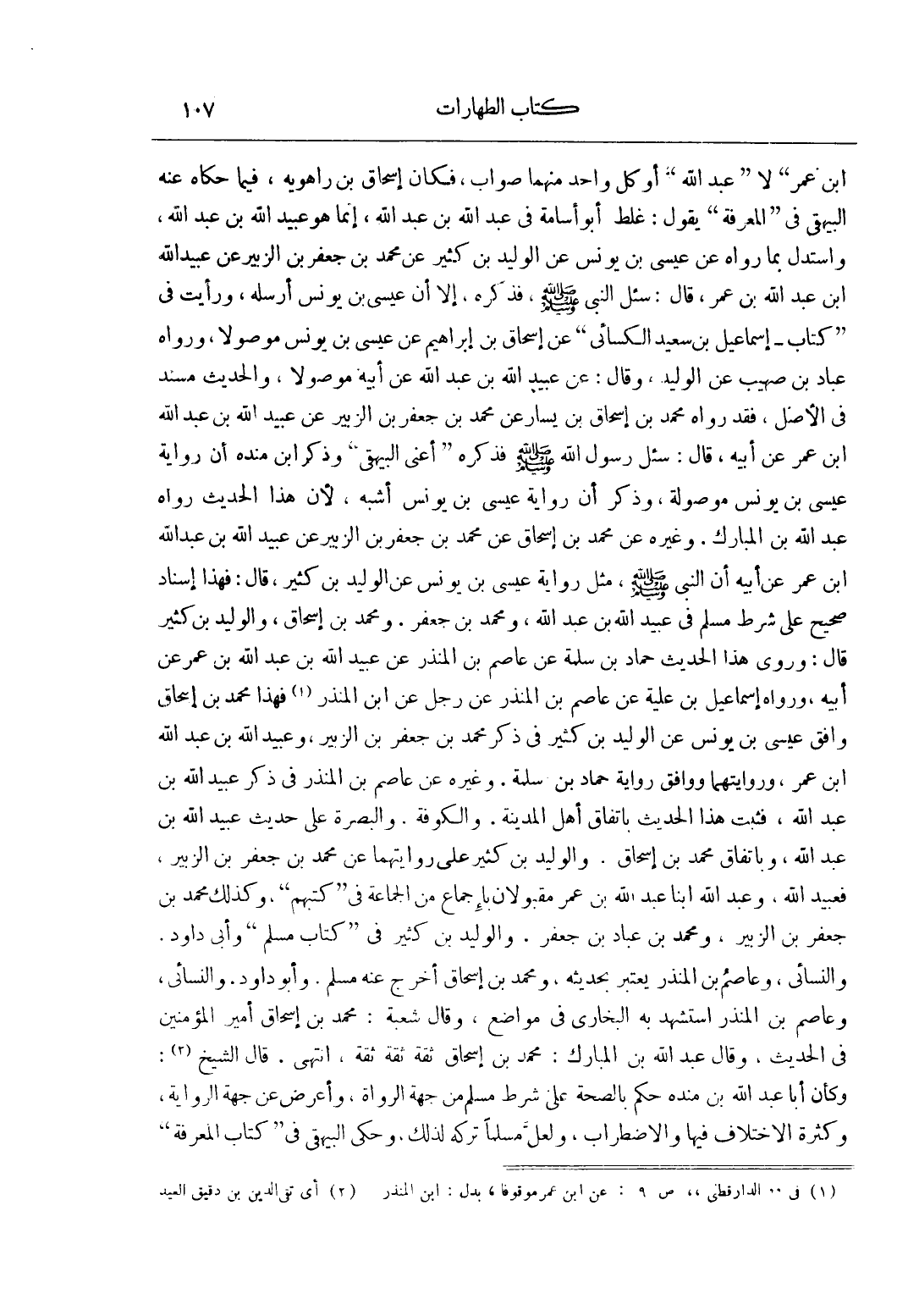 بْنُ عُمَرَ لَا عَبْدُ اللَّهِ أَوْ كُلُّ وَاحِدٍ مِنْهُمَا صَوَابٌ، فَكَأَنَّ إسْحَاقَ بْنَ رَاهْوَيْهِ، فِيمَا حَكَاهُ عَنْهُ الْبَيْهَقِيُّ فِي الْمَعْرِفَةِ يَقُولُ: غَلِطَ أَبُو أُسَامَةَ فِي عَبْدِ اللَّهِ بْنِ عَبْدِ اللَّهِ إنَّمَا هُوَ عُبَيْدُ اللَّهِ بْنُ عَبْدِ اللَّهِ، وَاسْتَدَلَّ بِمَا رَوَاهُ عَنْ عِيسَى بْنِ يُونُسَ عَنْ الْوَلِيدِ بْنِ كَثِيرٍ عَنْ مُحَمَّدِ بْنِ جَعْفَرِ بْنِ الزُّبَيْرِ عَنْ عُبَيْدِ اللَّهِ بْنِ عَبْدِ اللَّهِ بْنِ عُمَرَ قَالَ: سُئِلَ النَّبِيُّ صَلَّى اللَّهُ عَلَيْهِ وَسَلَّمَ، فَذَكَرَهُ، إلَّا أَنَّ عِيسَى بْنَ يُونُسَ أَرْسَلَهُ، وَرَأَيْت فِي كِتَابِ - إسْمَاعِيلَ بْنِ سَعِيدٍ الْكِسَائِيّ عَنْ إسْحَاقَ بْنِ إبْرَاهِيمَ عَنْ عِيسَى بْنِ يُونُسَ مَوْصُولًا، وَرَوَاهُ عَبَّادُ بْنُ صُهَيْبٍ عَنْ الْوَلِيدِ، وَقَالَ: عَنْ عُبَيْدِ اللَّهِ بْنِ عَبْدِ اللَّهِ عَنْ أَبِيهِ مَوْصُولًا، وَالْحَدِيثُ مُسْنَدٌ فِي الْأَصْلِ، فَقَدْ رَوَاهُ مُحَمَّدُ بْنُ إسْحَاقَ بْنِ يَسَارٍ عَنْ مُحَمَّدِ بْنِ جَعْفَرِ بْنِ الزُّبَيْرِ عَنْ عُبَيْدِ اللَّهِ بْنِ عَبْدِ اللَّهِ بْنِ عُمَرَ عَنْ أَبِيهِ، قَالَ: سُئِلَ رَسُولُ اللَّهِ صَلَّى اللَّهُ عَلَيْهِ وَسَلَّمَ فَذَكَرَهُ أَعْنِي الْبَيْهَقِيَّ وَذَكَرَ ابْنُ مَنْدَهْ عَنْ رِوَايَةِ عِيسَى بْنِ يُونُسَ مَوْصُولَةً، وَذَكَرَ أَنَّ رِوَايَةَ عِيسَى بْنِ يُونُسَ أَشْبَهُ، لِأَنَّ هَذَا الْحَدِيثَ رَوَاهُ عَبْدُ اللَّهِ بْنُ الْمُبَارَكِ. وَغَيْرُهُ عَنْ مُحَمَّدِ بْنِ إسْحَاقَ عَنْ مُحَمَّدِ بْنِ جَعْفَرِ بْنِ الزُّبَيْرِ عَنْ عُبَيْدِ اللَّهِ بْنِ عَبْدِ اللَّهِ بن عمر أَنَّ النَّبِيَّ صَلَّى اللَّهُ عَلَيْهِ وَسَلَّمَ، مِثْلَ رِوَايَةِ عِيسَى بْنِ يُونُسَ عَنْ الْوَلِيدِ بْنِ كَثِيرٍ، قَالَ: فَهَذَا إسْنَادٌ صَحِيحٌ عَلَى شَرْطِ مُسْلِمٍ فِي عُبَيْدِ اللَّهِ بْنِ عَبْدِ اللَّهِ، وَمُحَمَّدِ بْنِ جَعْفَرٍ، وَمُحَمَّدِ بْنِ إسْحَاقَ. وَالْوَلِيدِ بْنِ كثير قال: روى هَذَا الْحَدِيثَ حَمَّادُ بْنُ سَلَمَةَ عَنْ عَاصِمِ بْنِ الْمُنْذِرِ عَنْ عُبَيْدِ اللَّهِ بْنِ عَبْدِ اللَّهِ بْنِ عُمَرَ عَنْ أَبِيهِ، رَوَاهُ إسْمَاعِيلُ ابْنُ عُلَيَّةَ عَنْ عَاصِمِ بْنِ الْمُنْذِرِ عَنْ رَجُلٍ عَنْ ابْنِ الْمُنْذِرِ1 فَهَذَا مُحَمَّدُ بْنُ إسْحَاقَ وَافَقَ عِيسَى بْنَ يُونُسَ عَنْ الْوَلِيدِ بْنِ كَثِيرٍ فِي ذِكْرِ مُحَمَّدِ بْنِ جَعْفَرِ بْنِ الزُّبَيْرِ، وَعُبَيْدِ اللَّهِ بْنِ عَبْدِ اللَّهِ بن عمر، وروايتهما وافق رِوَايَةَ حَمَّادِ بْنِ سَلَمَةَ. وَغَيْرِهِ عَنْ عَاصِمِ بْنِ الْمُنْذِرِ فِي ذِكْرِ عُبَيْدِ اللَّهِ بْنِ عَبْدِ اللَّهِ، فَثَبَتَ هَذَا الْحَدِيثُ بِاتِّفَاقِ أَهْلِ الْمَدِينَةِ. وَالْكُوفَةِ. وَالْبَصْرَةِ عَلَى حَدِيثِ عُبَيْدِ اللَّهِ بْنِ عَبْدِ اللَّهِ، وَبِاتِّفَاقِ مُحَمَّدِ بْنِ إسْحَاقَ. وَالْوَلِيدِ بْنِ كَثِيرٍ عَنْ رِوَايَتِهِمَا عَنْ مُحَمَّدِ بْنِ جَعْفَرِ بْنِ الزُّبَيْرِ، فَعُبَيْدُ اللَّهِ. وَعَبْدُ اللَّهِ ابْنَا عَبْدِ اللَّهِ بْنِ عُمَرَ مَقْبُولَانِ بِإِجْمَاعٍ مِنْ الْجَمَاعَةِ فِي كُتُبِهِمْ، وَكَذَلِكَ مُحَمَّدُ بْنُ جَعْفَرِ بْنِ الزُّبَيْرِ، وَمُحَمَّدُ بْنُ عَبَّادِ بْنِ جَعْفَرٍ. وَالْوَلِيدُ بْنُ كَثِيرٍ فِي كِتَابِ مُسْلِمٍ وَأَبِي دَاوُد. وَالنَّسَائِيُّ، وَعَاصِمُ بْنُ الْمُنْذِرِ يُعْتَبَرُ بِحَدِيثِهِ، وَمُحَمَّدُ بْنُ إسْحَاقَ أَخْرَجَ عَنْهُ مُسْلِمٌ. وَأَبُو دَاوُد. وَالنَّسَائِيُّ، وَعَاصِمُ بْنُ الْمُنْذِرِ اسْتَشْهَدَ بِهِ الْبُخَارِيُّ فِي مَوَاضِعَ، وَقَالَ شُعْبَةُ: مُحَمَّدُ بْنُ إسْحَاقَ أَمِيرُ الْمُؤْمِنِينَ فِي الْحَدِيثِ، وَقَالَ عَب