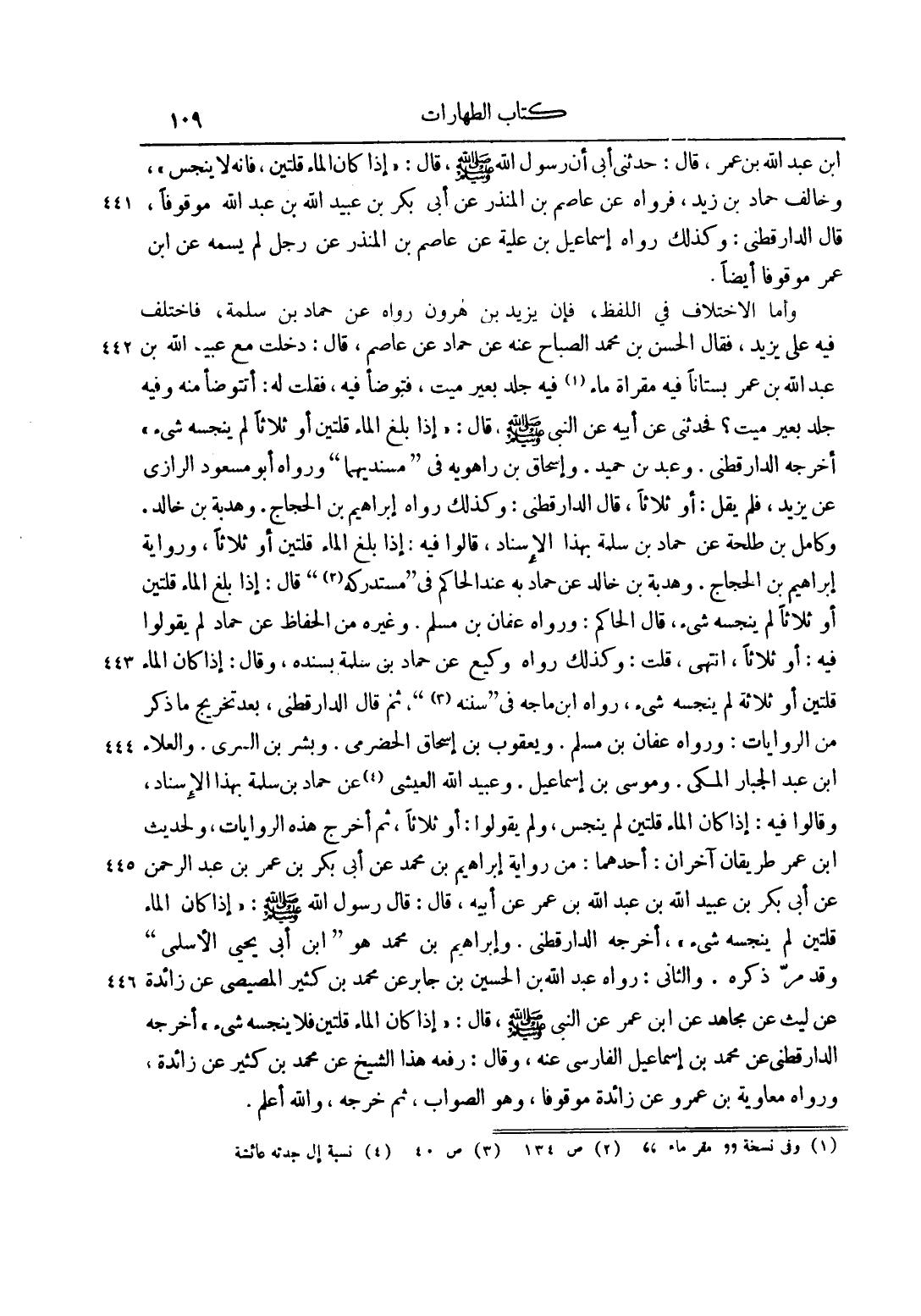 بْنِ عَبْدِ اللَّهِ بْنِ عُمَرَ، قَالَ: حَدَّثَنِي أَبِي أَنَّ رَسُولَ اللَّهِ صَلَّى اللَّهُ عَلَيْهِ وَسَلَّمَ، قَالَ: "إذَا كَانَ الْمَاءُ قُلَّتَيْنِ، فَإِنَّهُ لَا يُنَجَّسُ"، وَخَالَفَ حَمَّادُ بْنُ زَيْدٍ، فَرَوَاهُ عَنْ عَاصِمِ بْنِ الْمُنْذِرِ عَنْ أَبِي بَكْرِ بْنِ عُبَيْدِ اللَّهِ بْنِ عَبْدِ اللَّهِ مَوْقُوفًا، قَالَ الدَّارَقُطْنِيُّ: وَكَذَلِكَ رَوَاهُ إسْمَاعِيلُ ابْنُ عُلَيَّةَ عَنْ عَاصِمِ بْنِ الْمُنْذِرِ عَنْ رَجُلٍ لَمْ يُسَمِّهِ عَنْ ابْنِ عُمَرَ مَوْقُوفًا أَيْضًا.